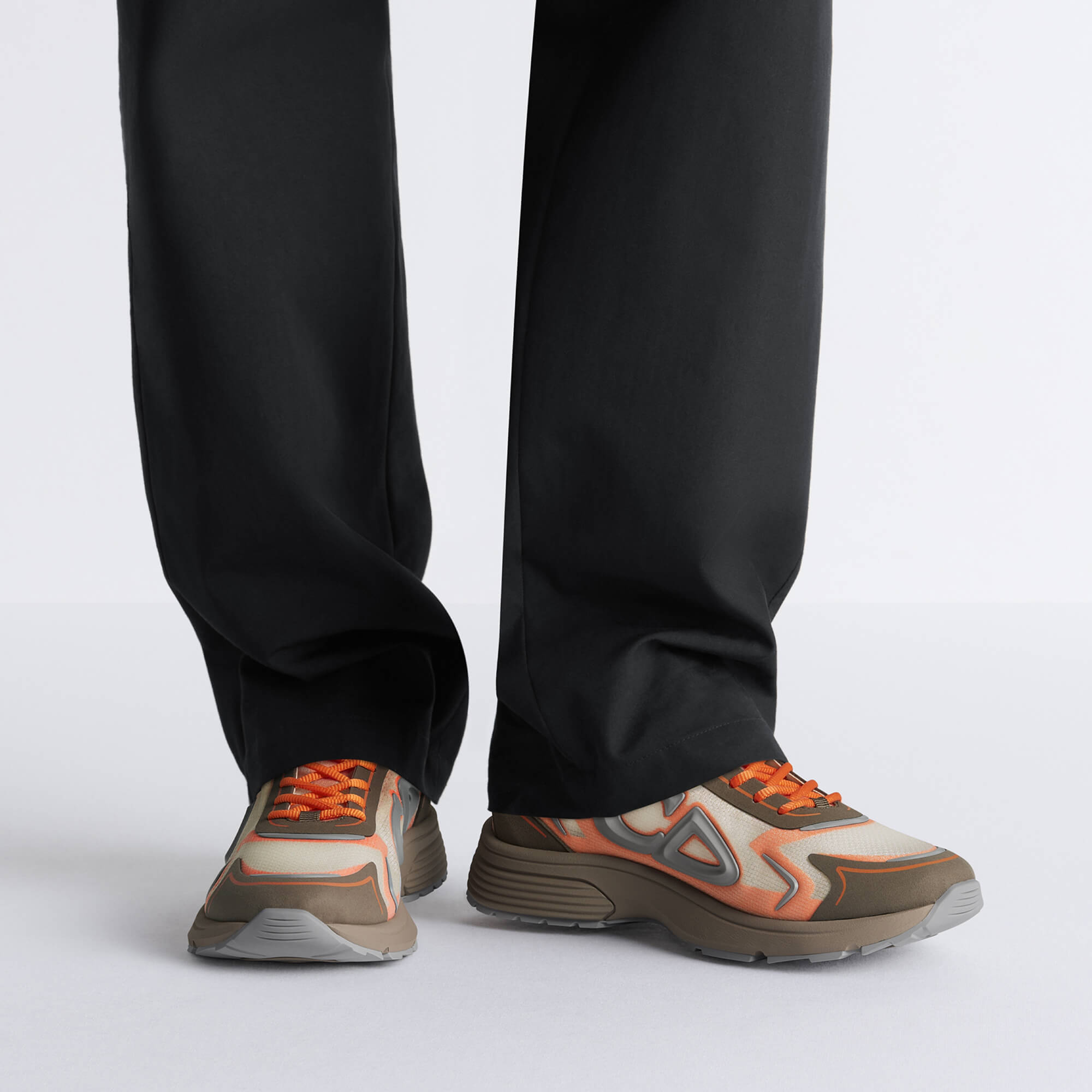 נעלי סניקרס מניילון חצי־שקוף בצבע בז׳, בד טכני בצבע חום וכתום, וגומי אפור