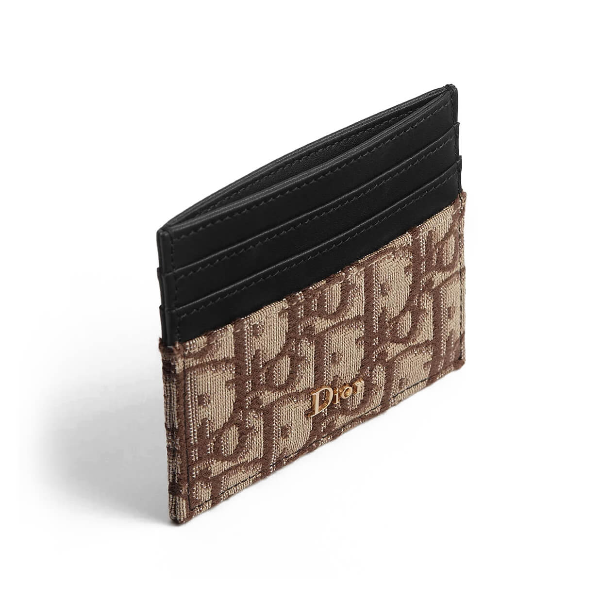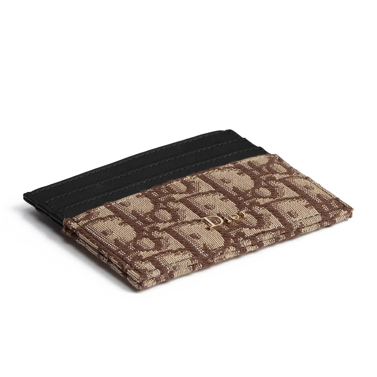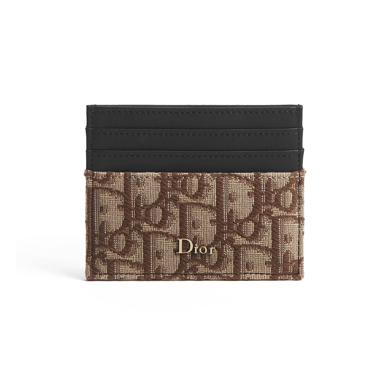 מחזיק כרטיסים מאריג Dior Oblique בצבע חום בשילוב עור calfskin שחור וחלק