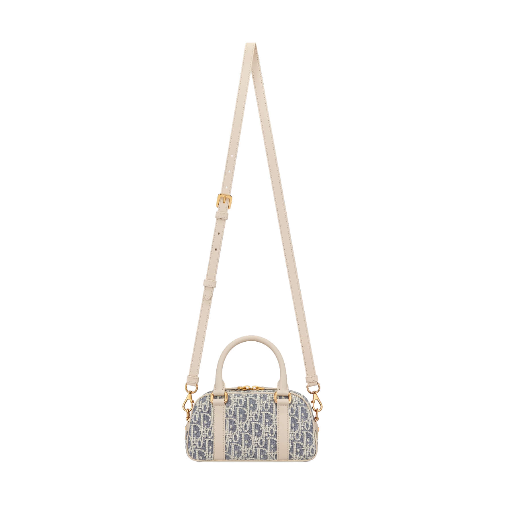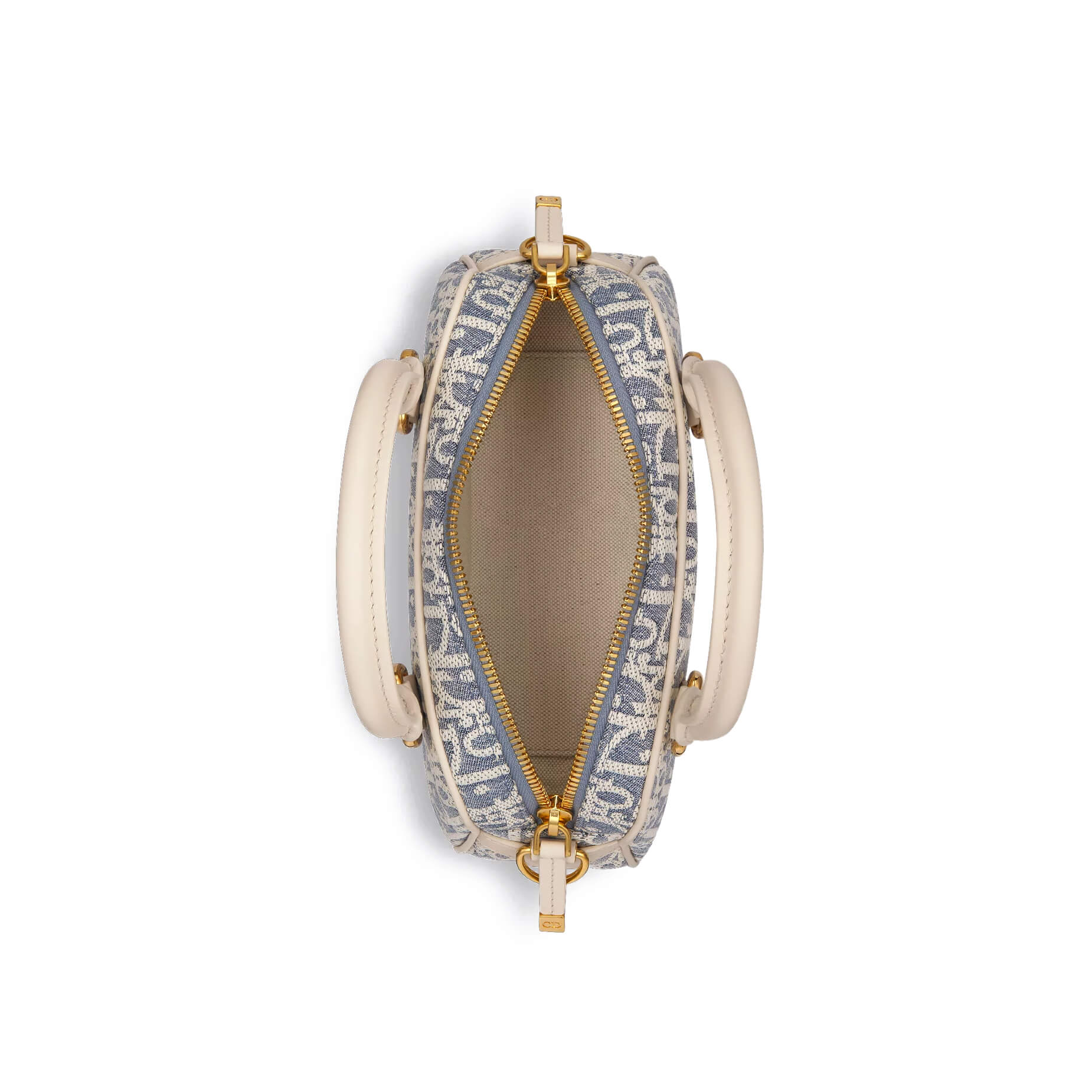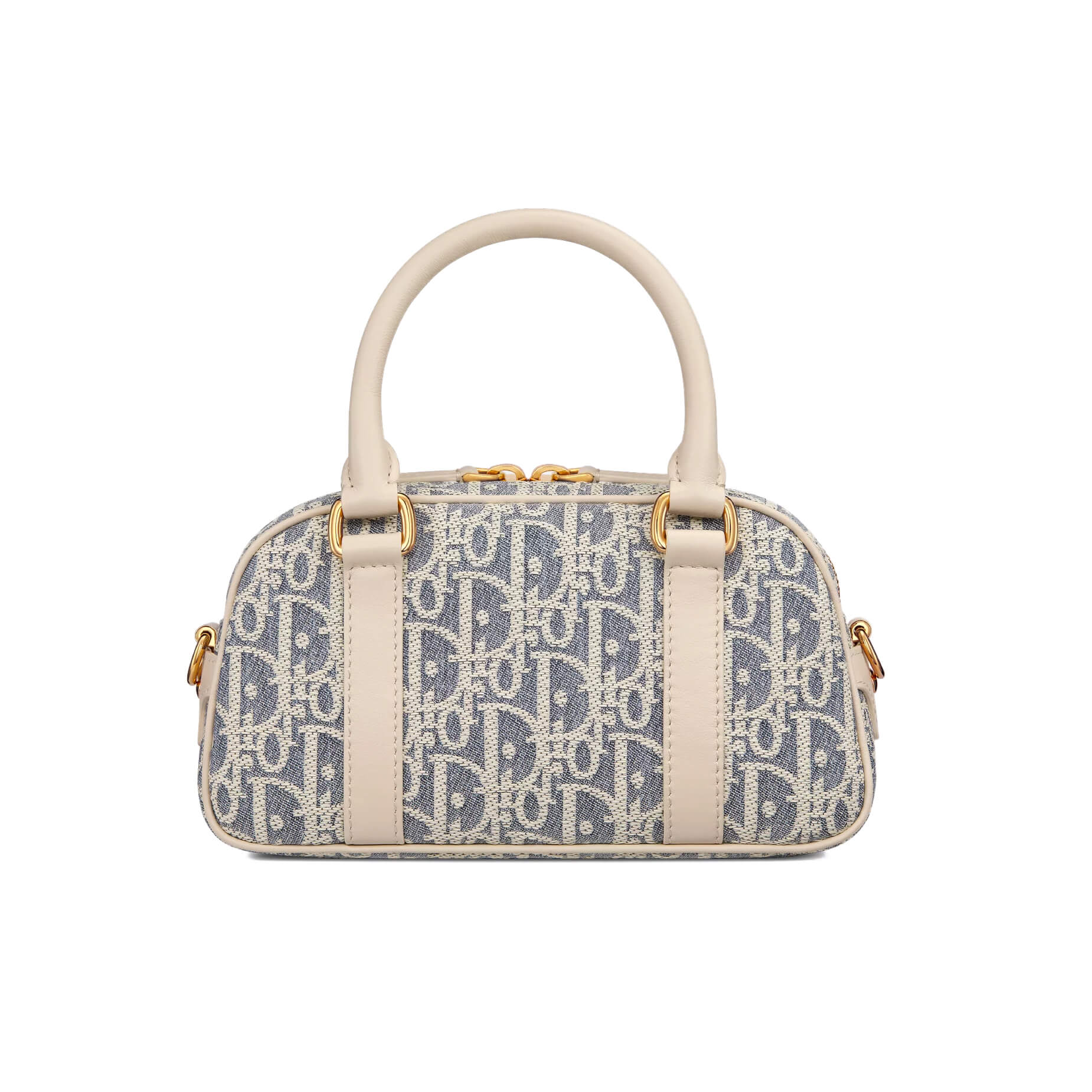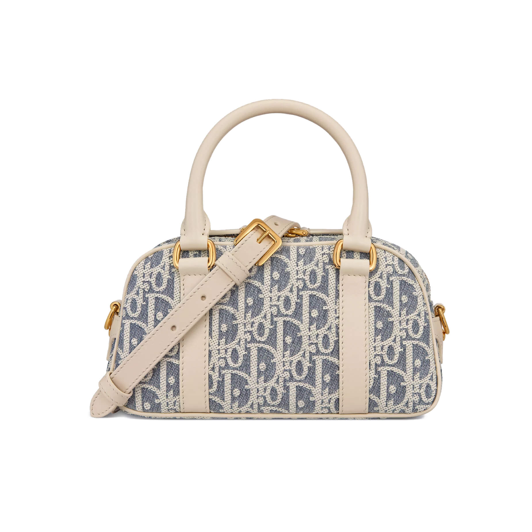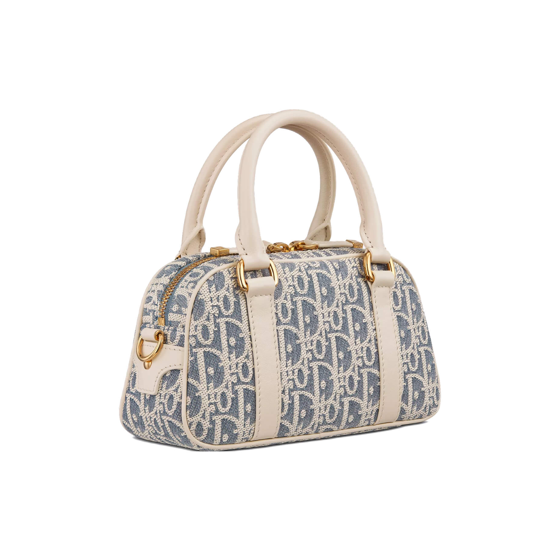 תיק מיני מאריג Chambray בצבע כחול עם דוגמת Dior Oblique מחוט ראפייה, בשילוב עור בצבע קרם