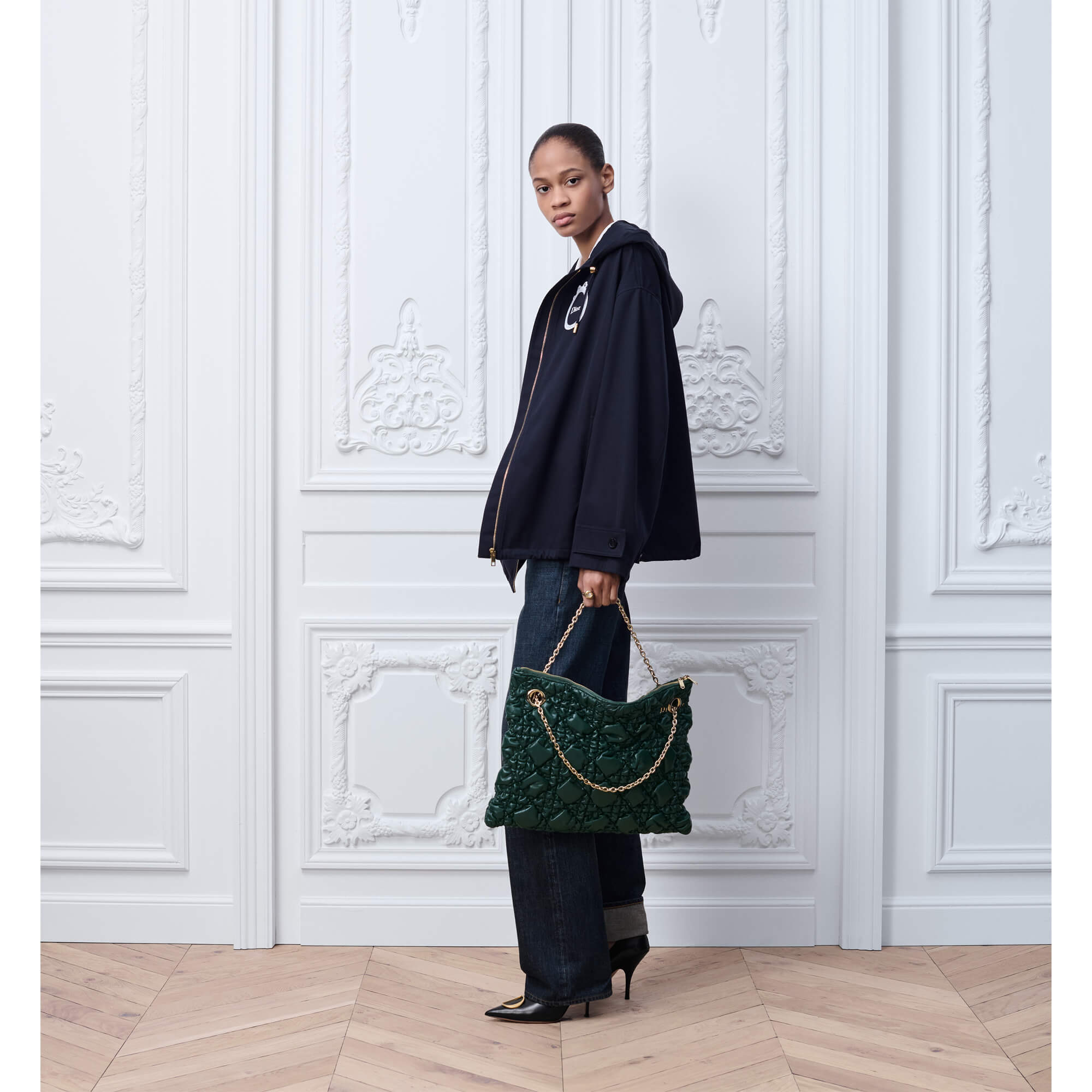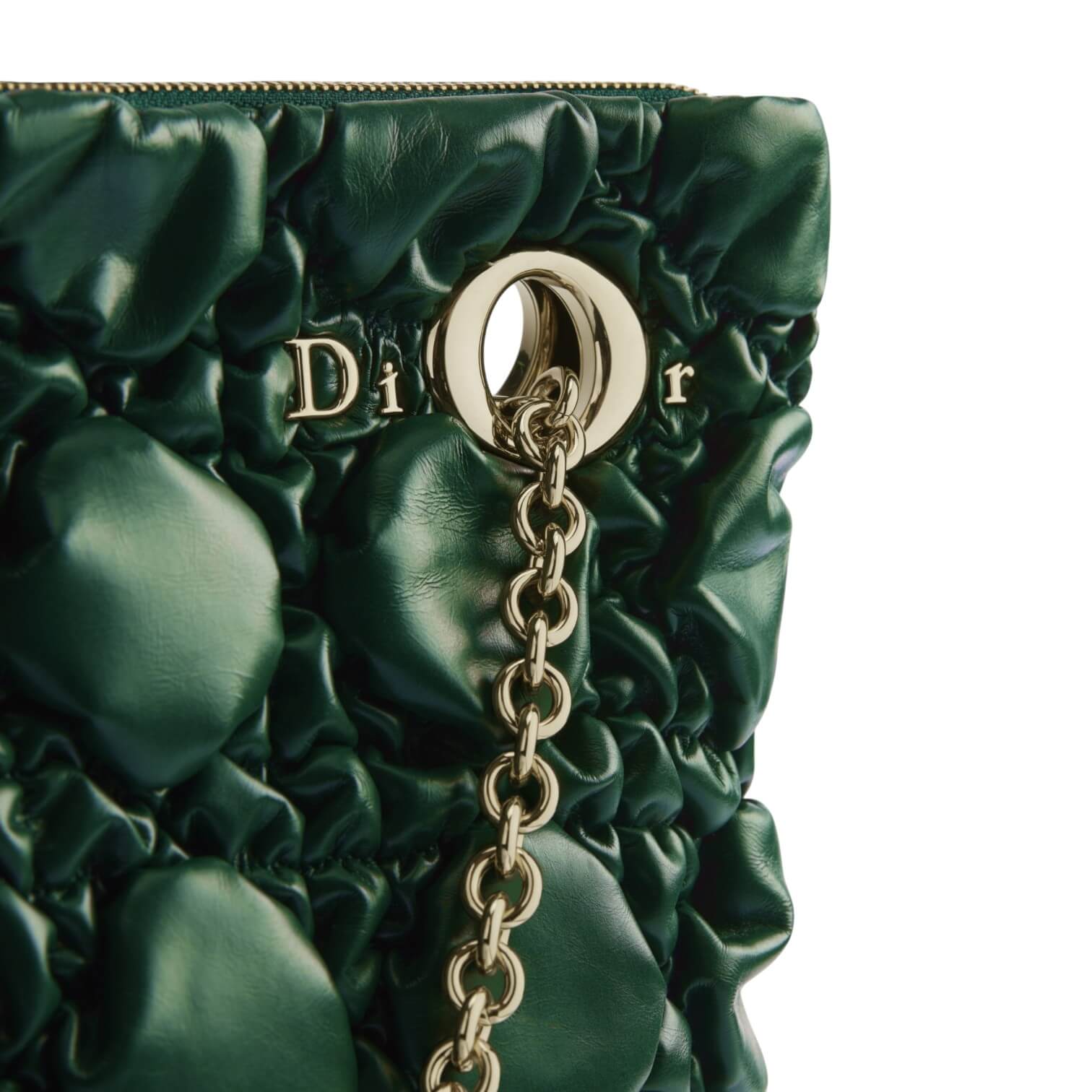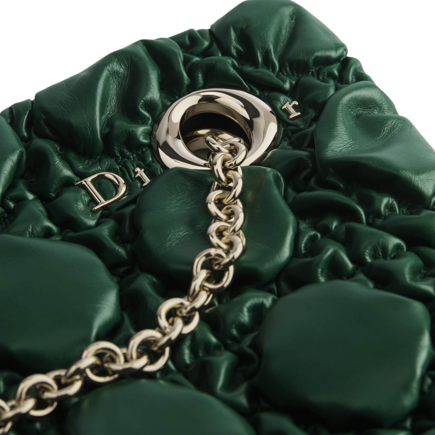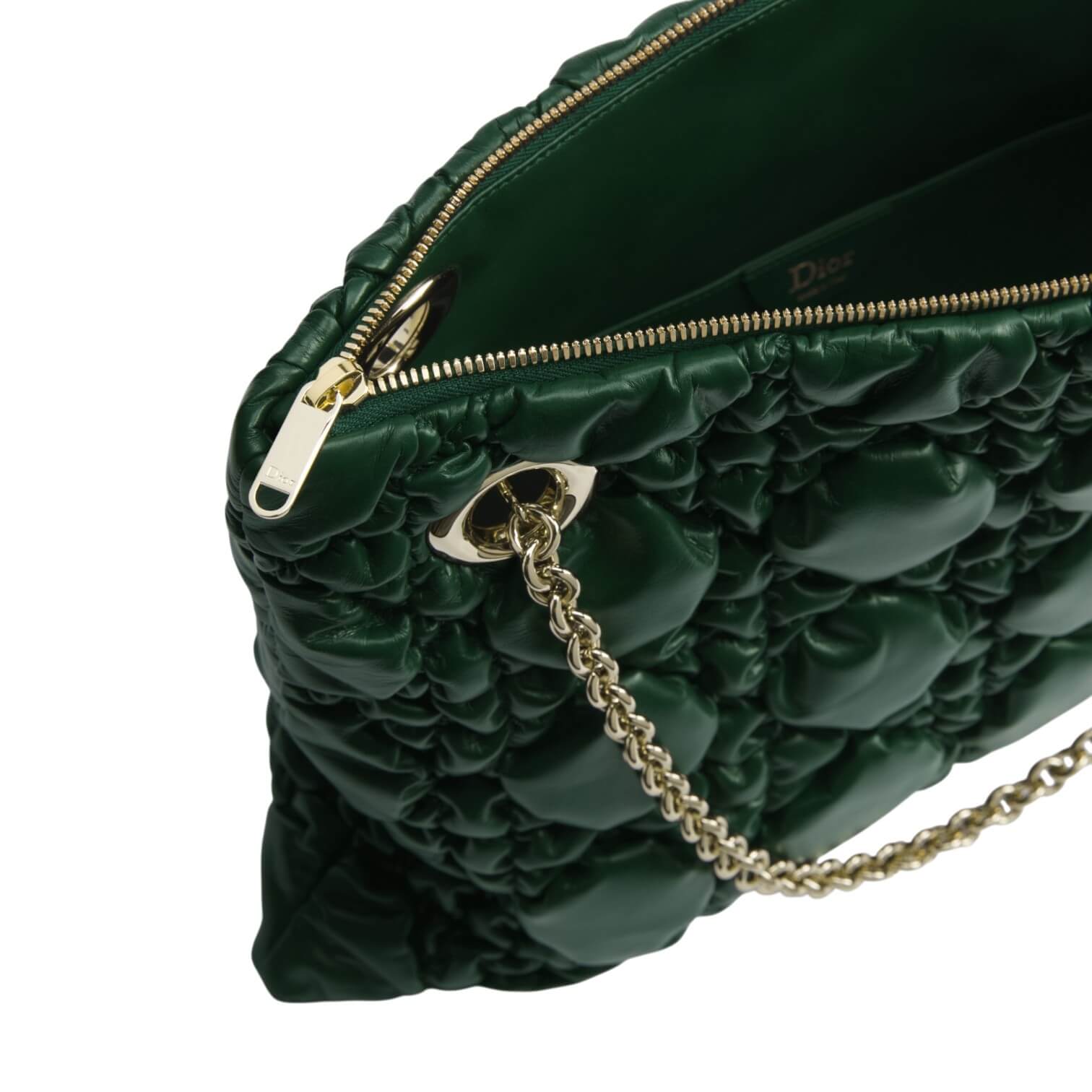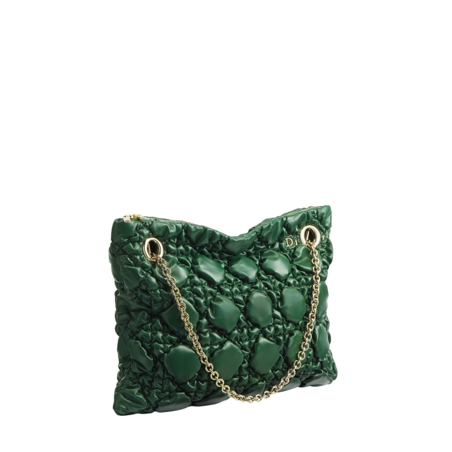 תיק בינוני מעור בצבע ירוק כהה עם תיפורי Macrocannage במראה מנופח