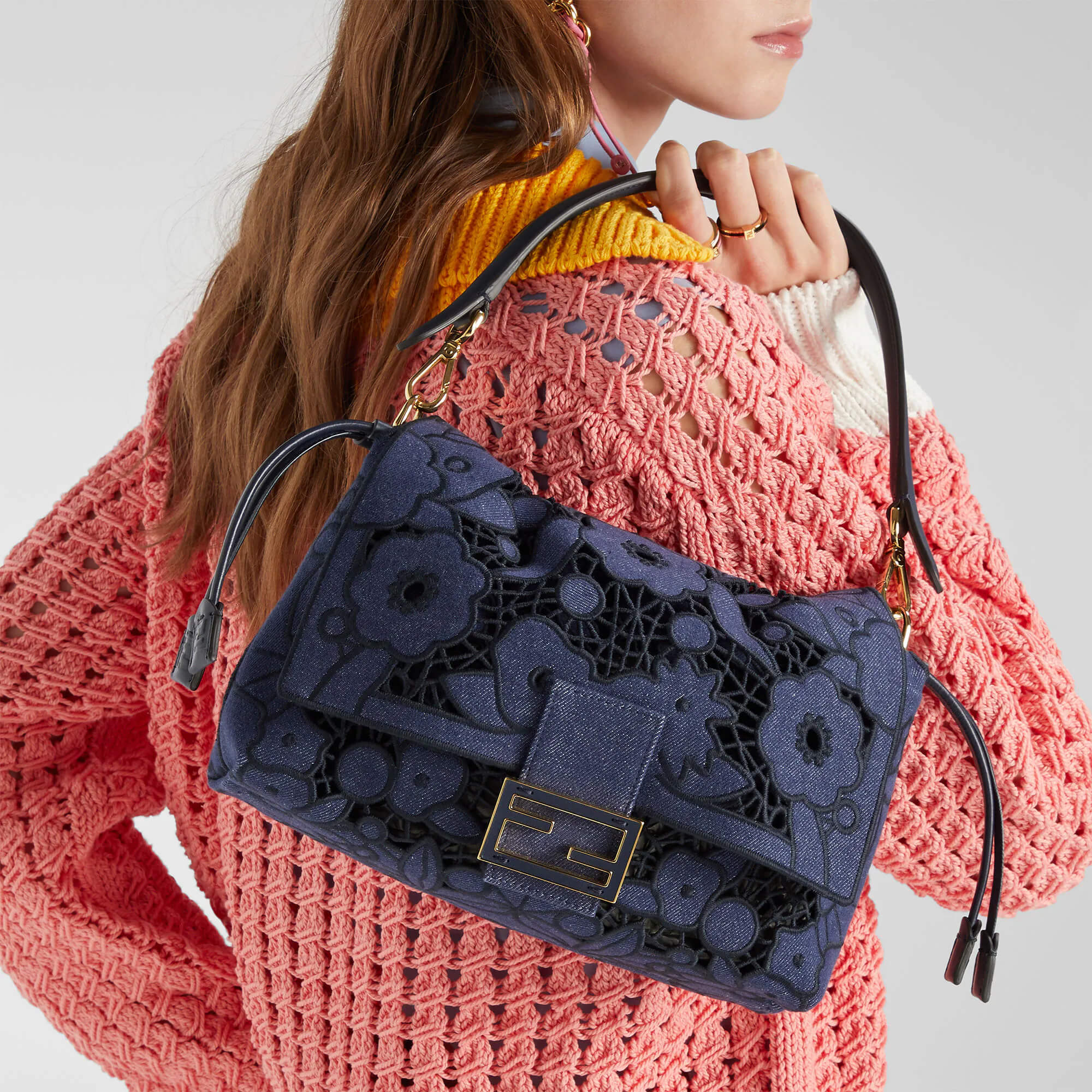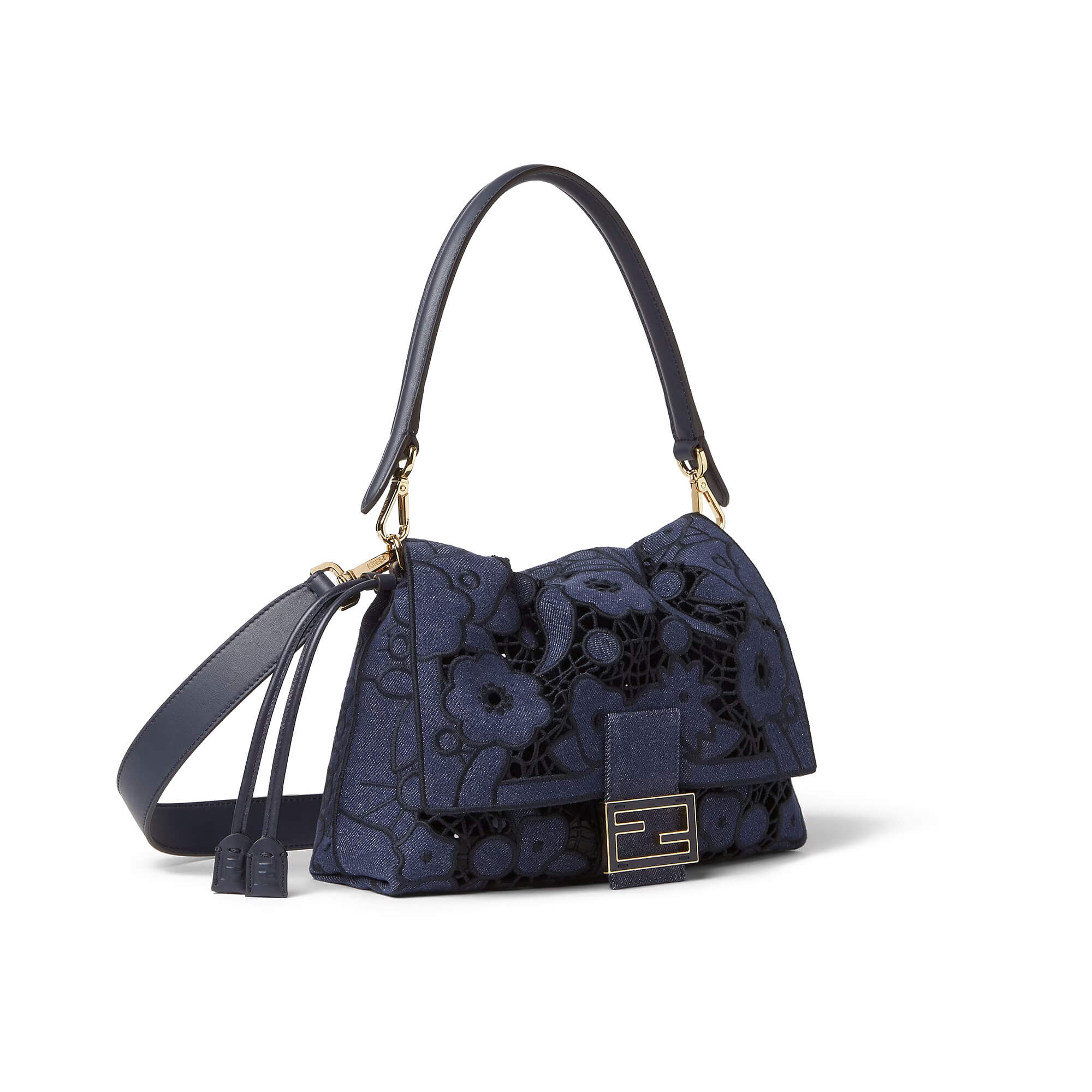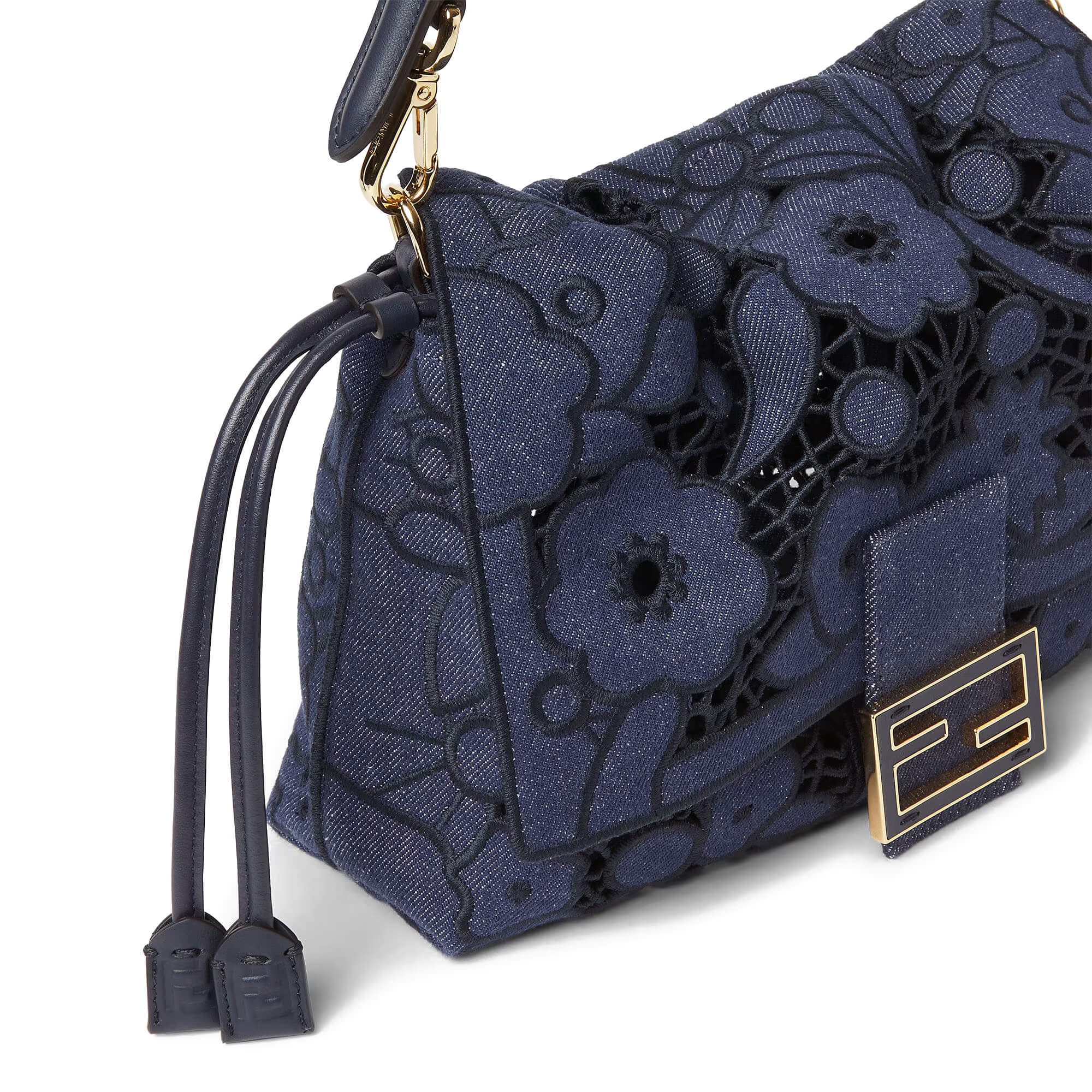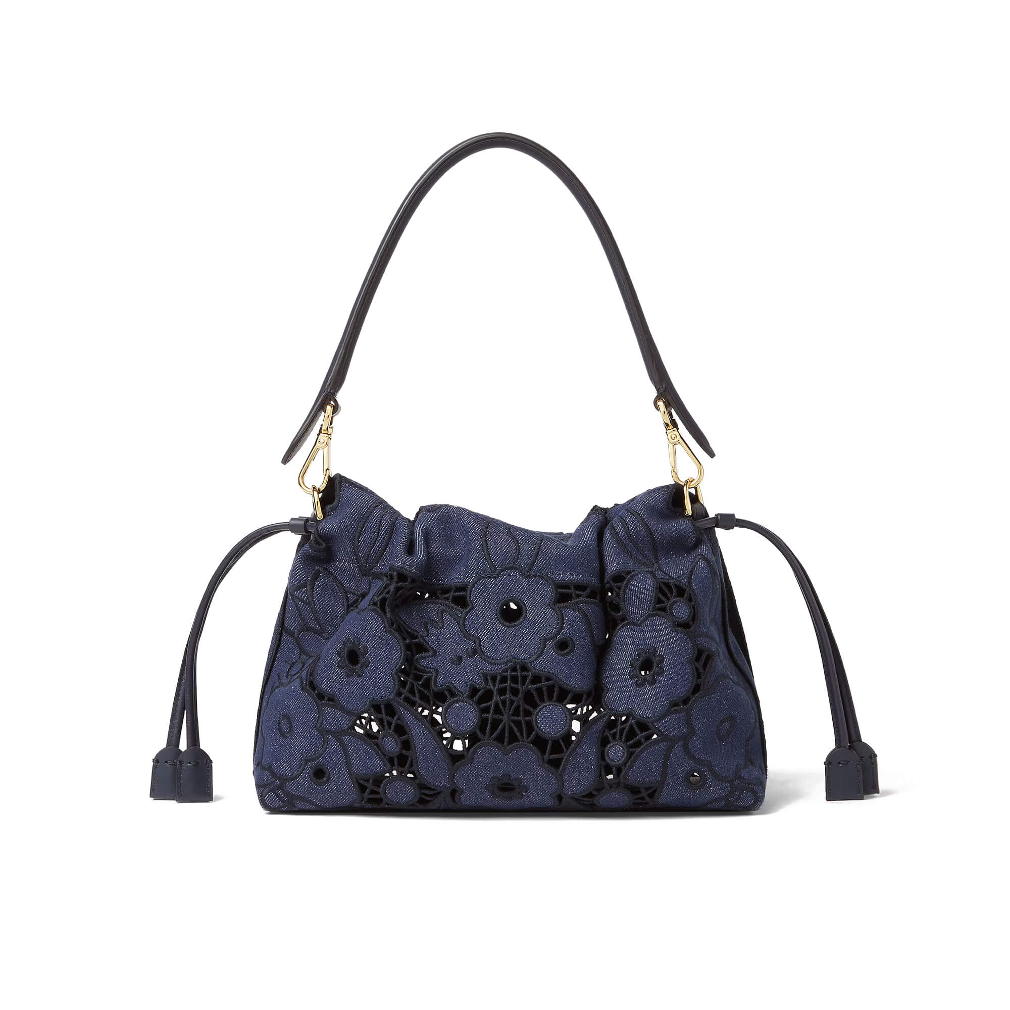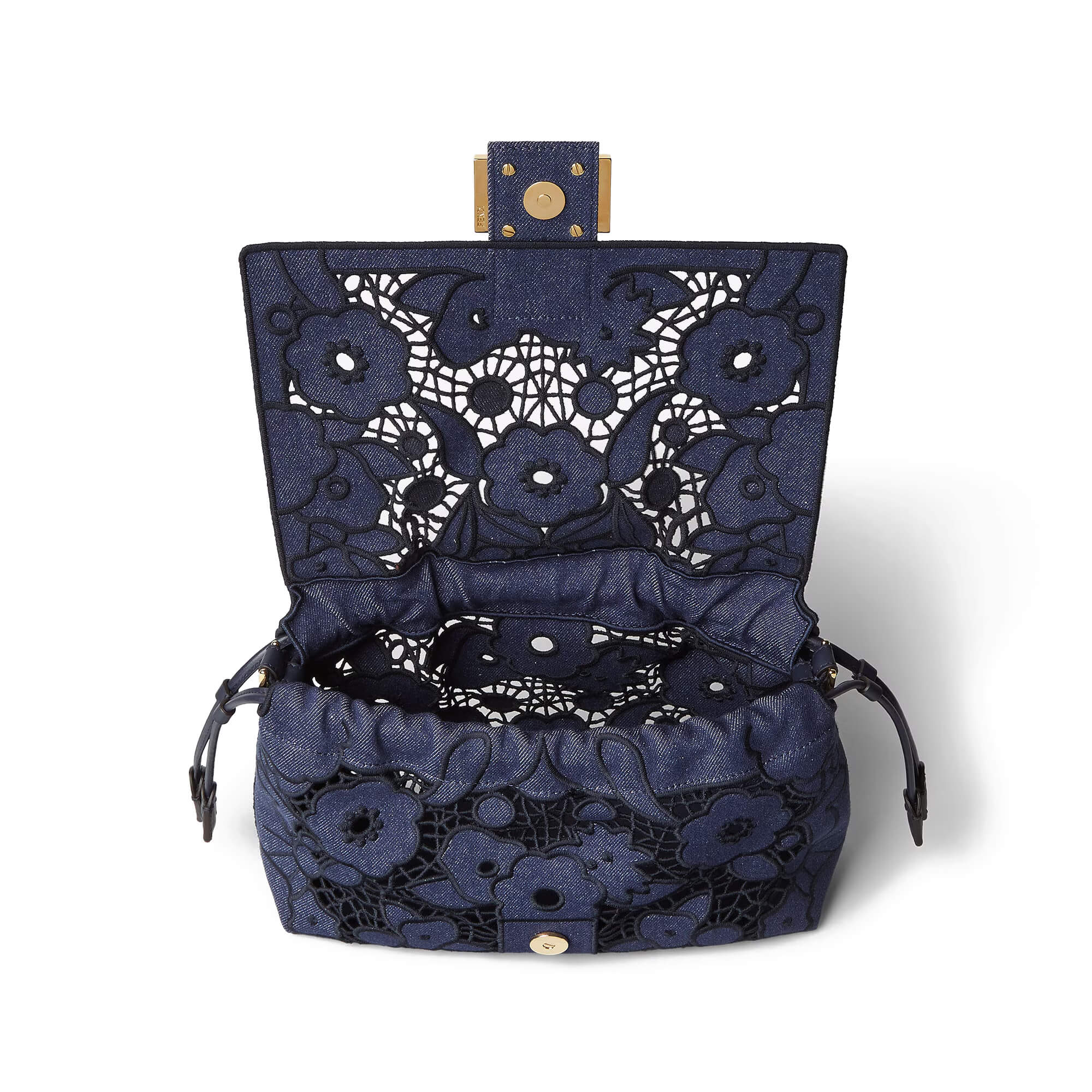 עשוי מבד דנים בצבע כחול כהה עם דוגמת פרחים מחוררת – Floral À Jour