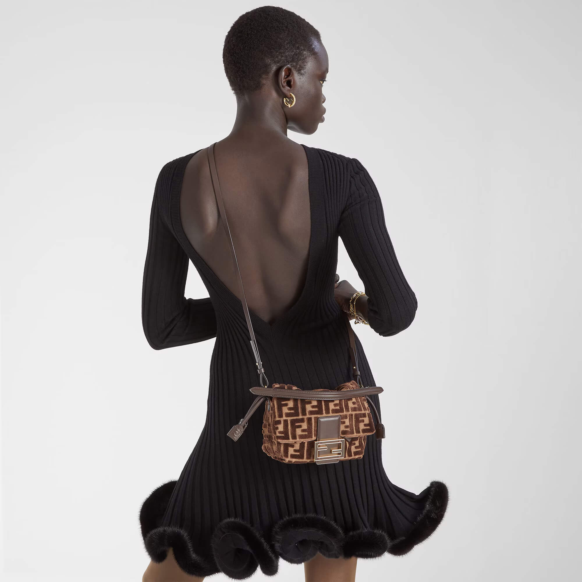 עשוי מקטיפת jacquard עם דוגמת FF מובלטת בצבע חום כהה על רקע חום