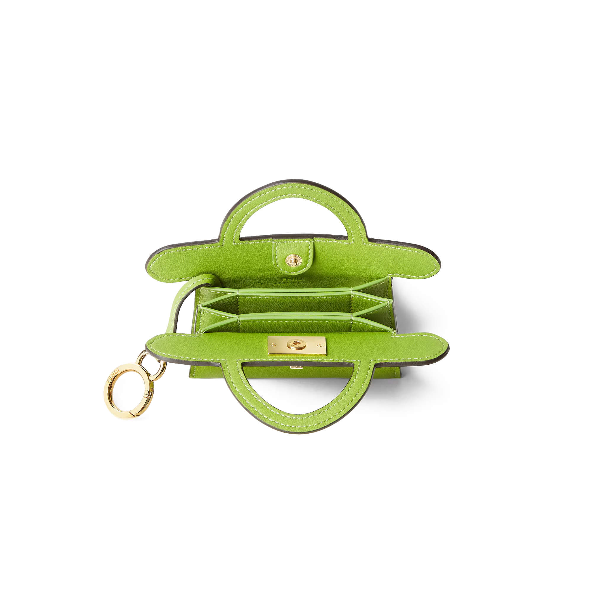 ארנק כרטיסים Fendi Way בצורת תיק מעור בצבע ירוק שלושה תאים פנימיים ושני כיסים שטוחים עם סגירת תיק־תק נסתרת וו מתכת עגול עם חריטת לוגו Fendi לחיבור לתיק עיטור מנעול טוויסט דקורטיבי אביזרים בצבע זהב גובה: 12.5 ס״מ עומק: 3 ס״מ