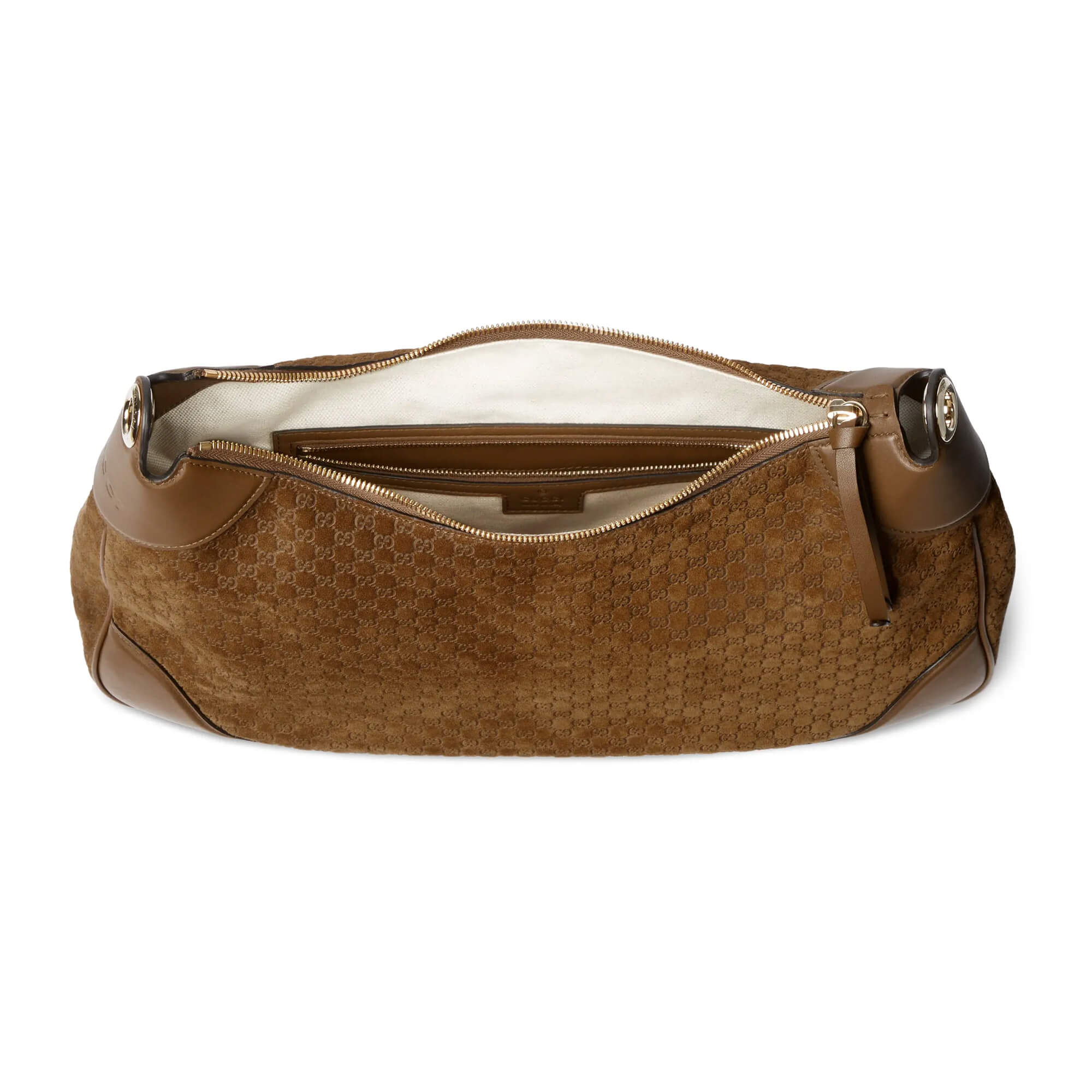 זמש בצבע חום עם דוגמת מיקרו GG מובלטת עיטור עור בצבע חום אביזרים בצבע זהב בהיר בטנת כותנה-פשתן בצבע חום כיס אחד עם רוכסן ידית עליונה עם סגירת קרס, בגובה 25 ס״מ סגירת רוכסן רוחב: 40 ס״מ גובה: 25 ס״מ עומק: 9 ס״מ משקל: כ־0.75 ק״ג