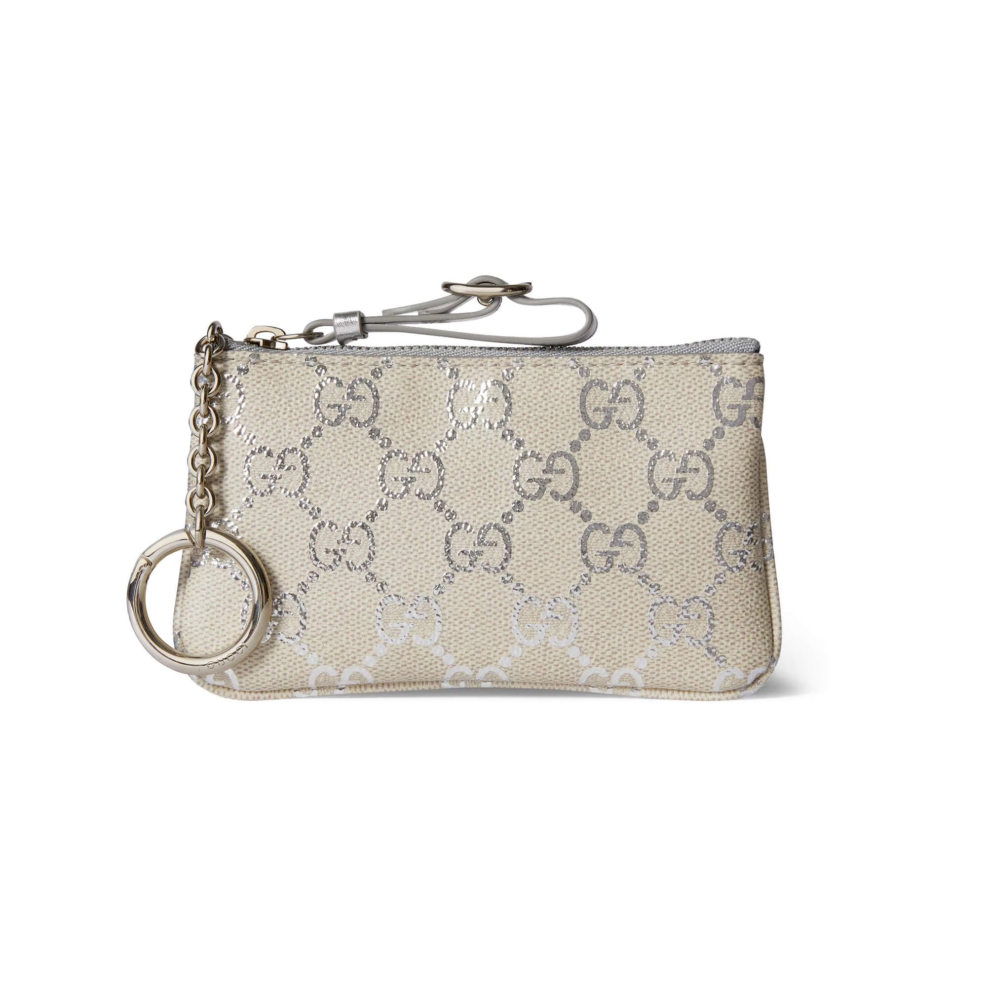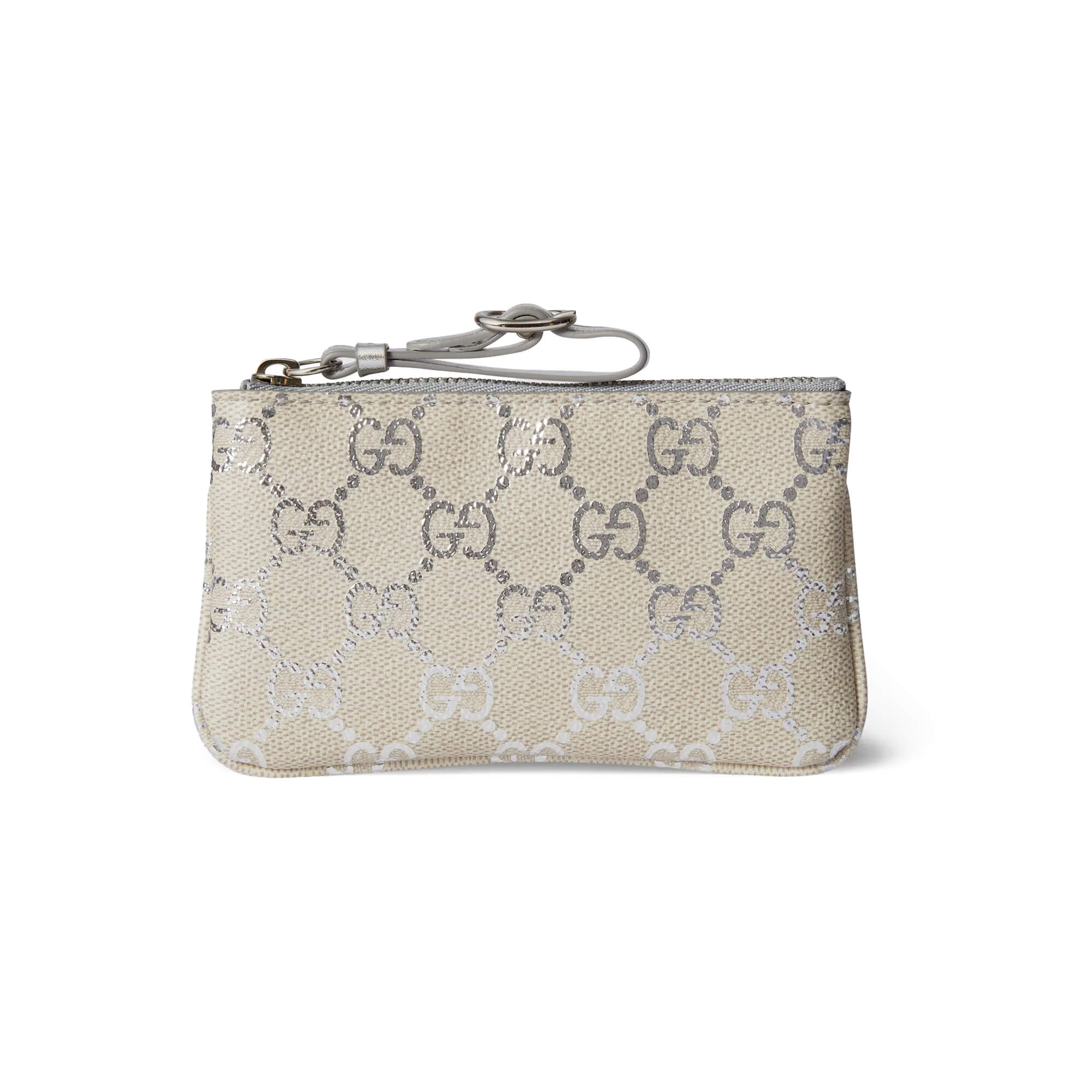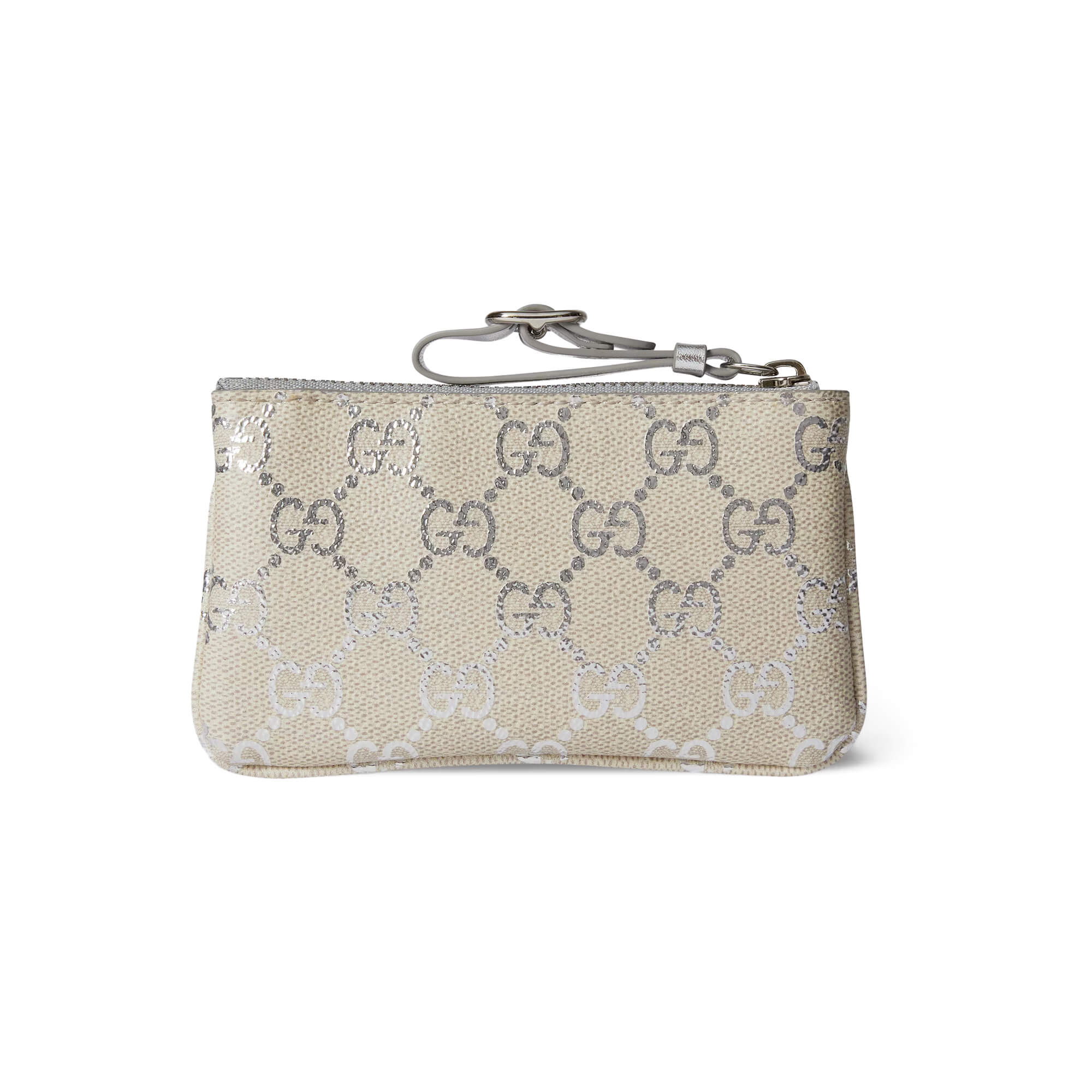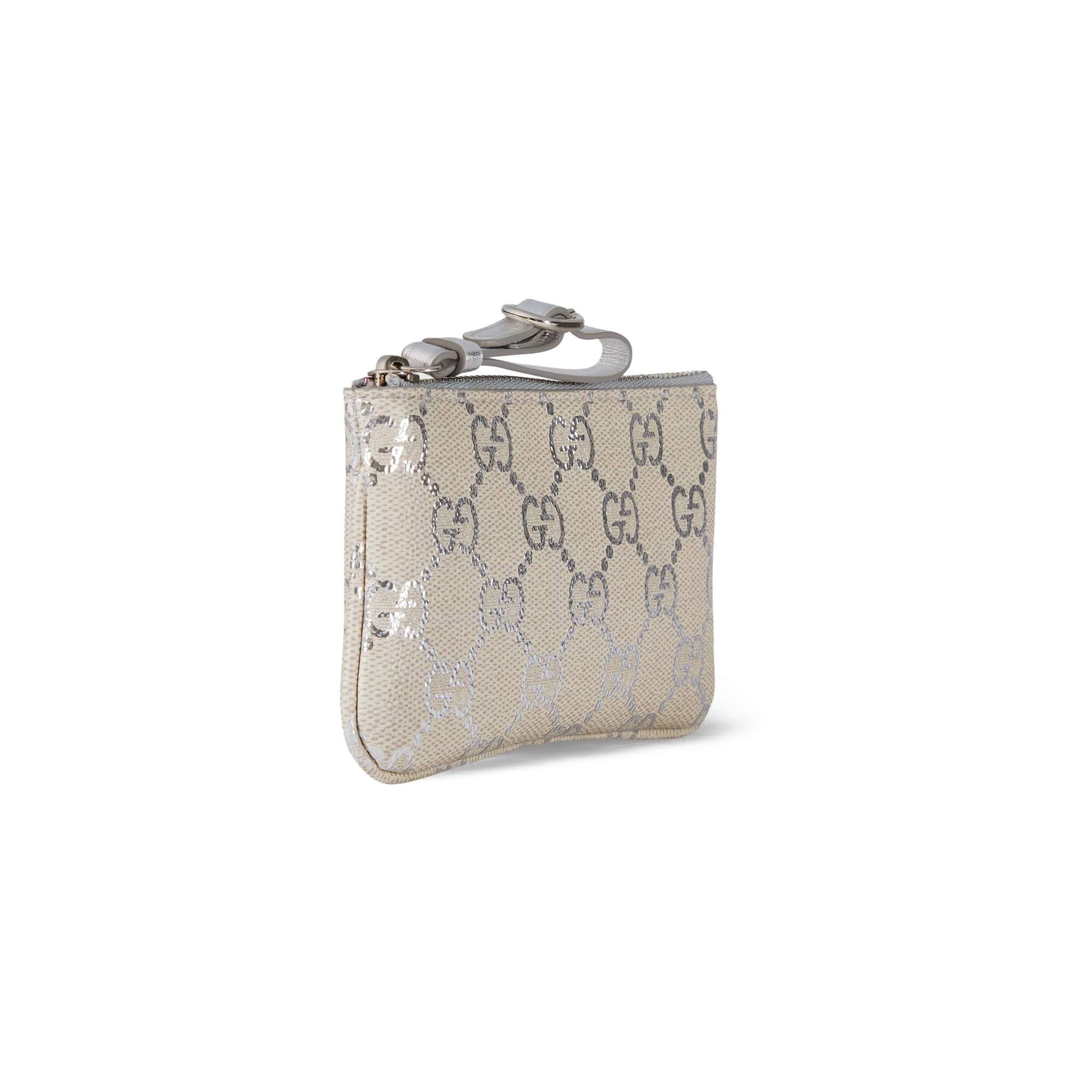 בד מצופה בדוגמת GG Monogram בגימור למינציה בצבע בז׳ בהיר וכסף מטאלי
