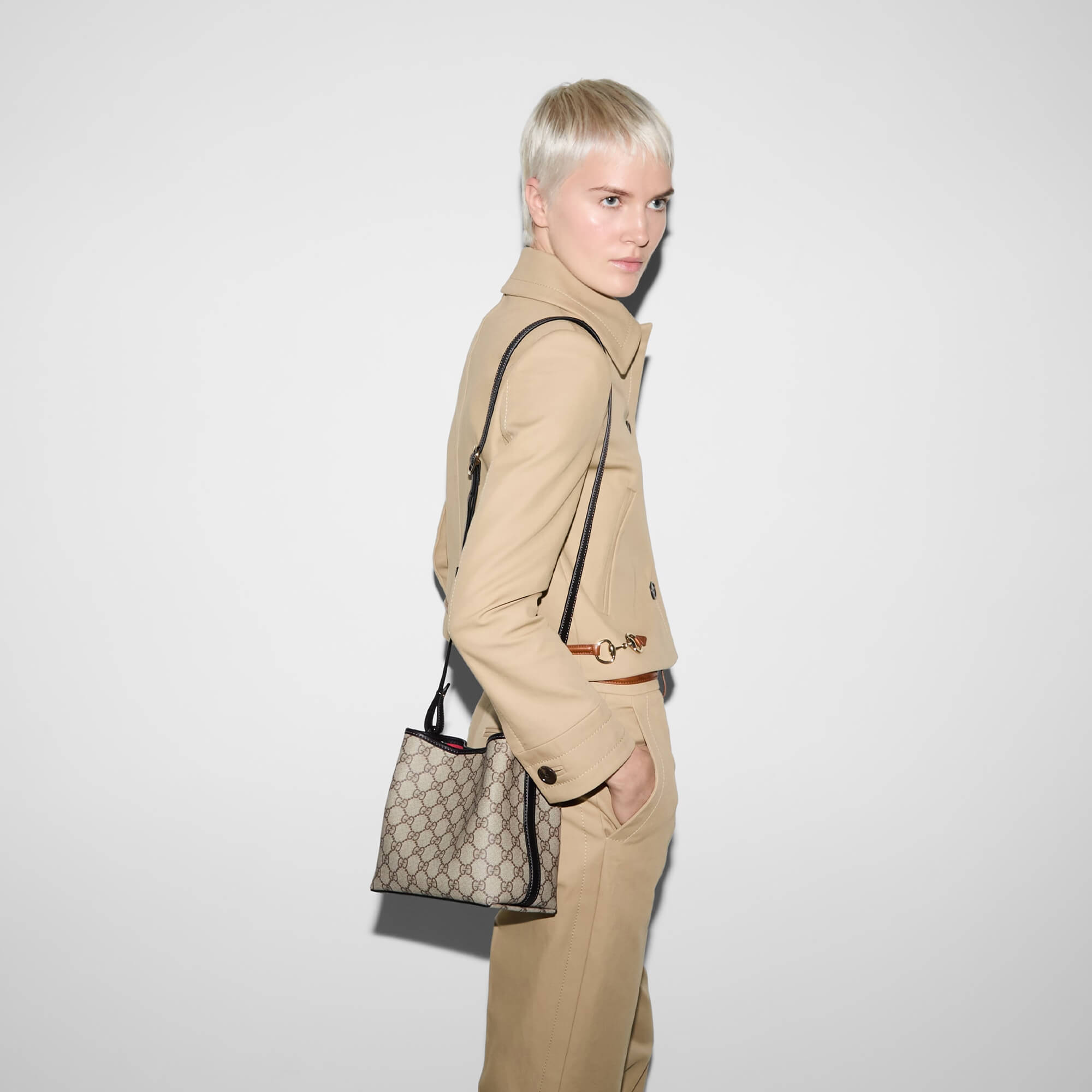 תיק קטן מאריג GG Monogram מצופה בצבע בז׳ וחום