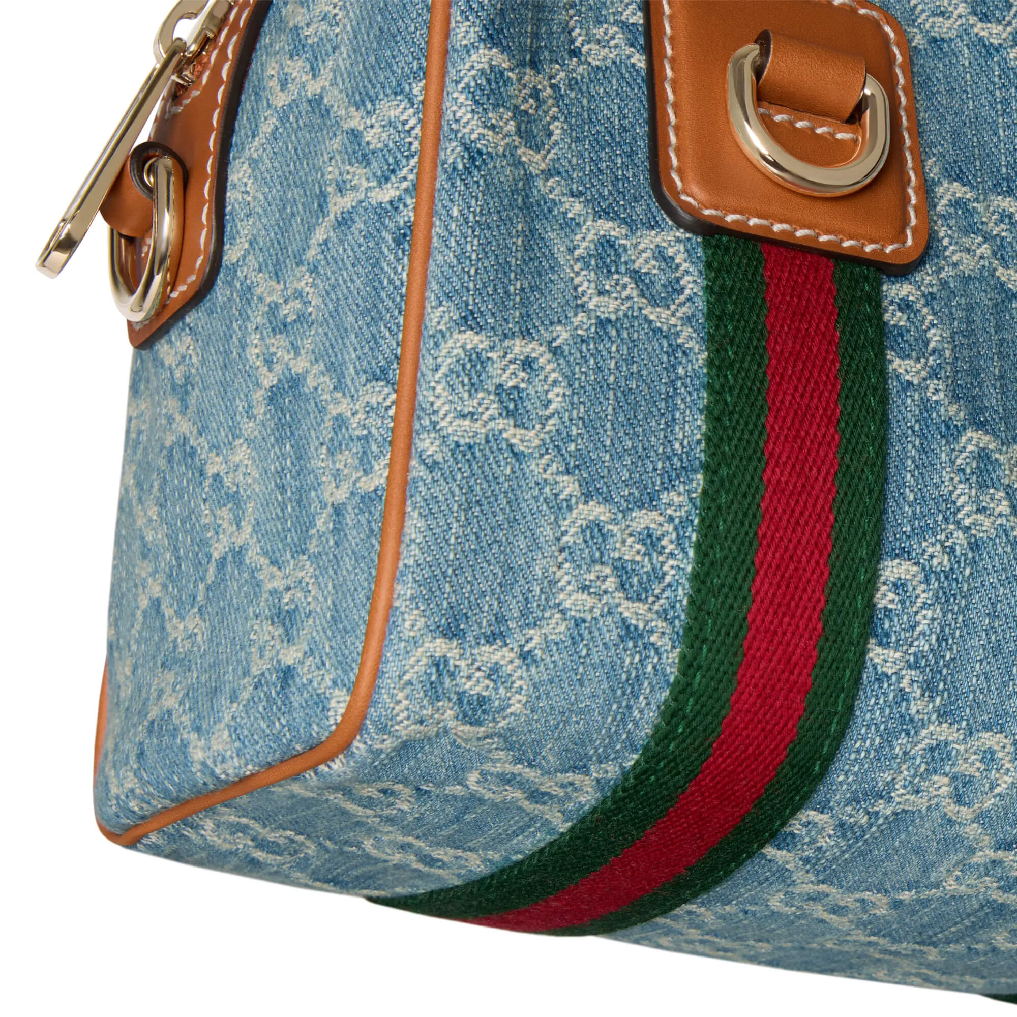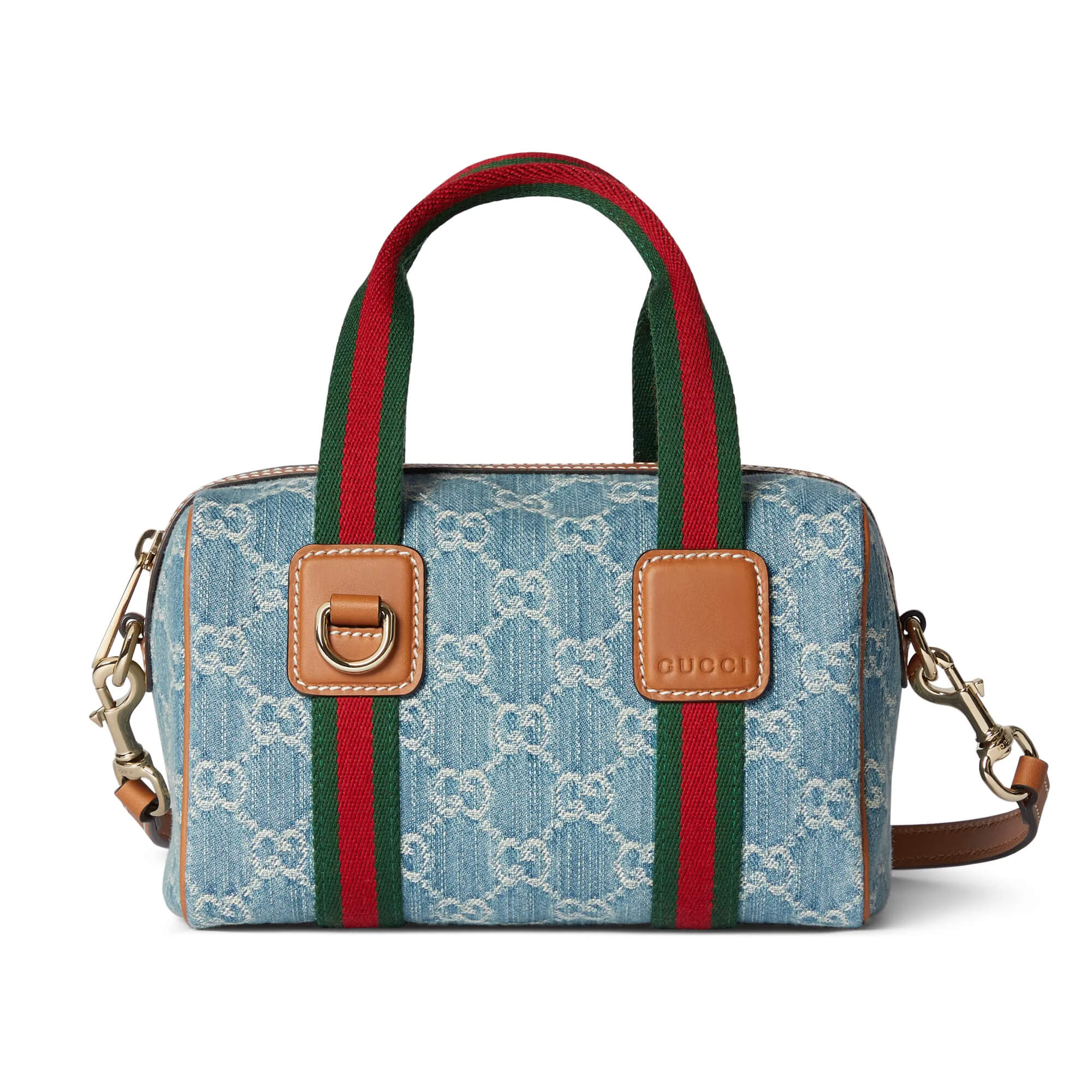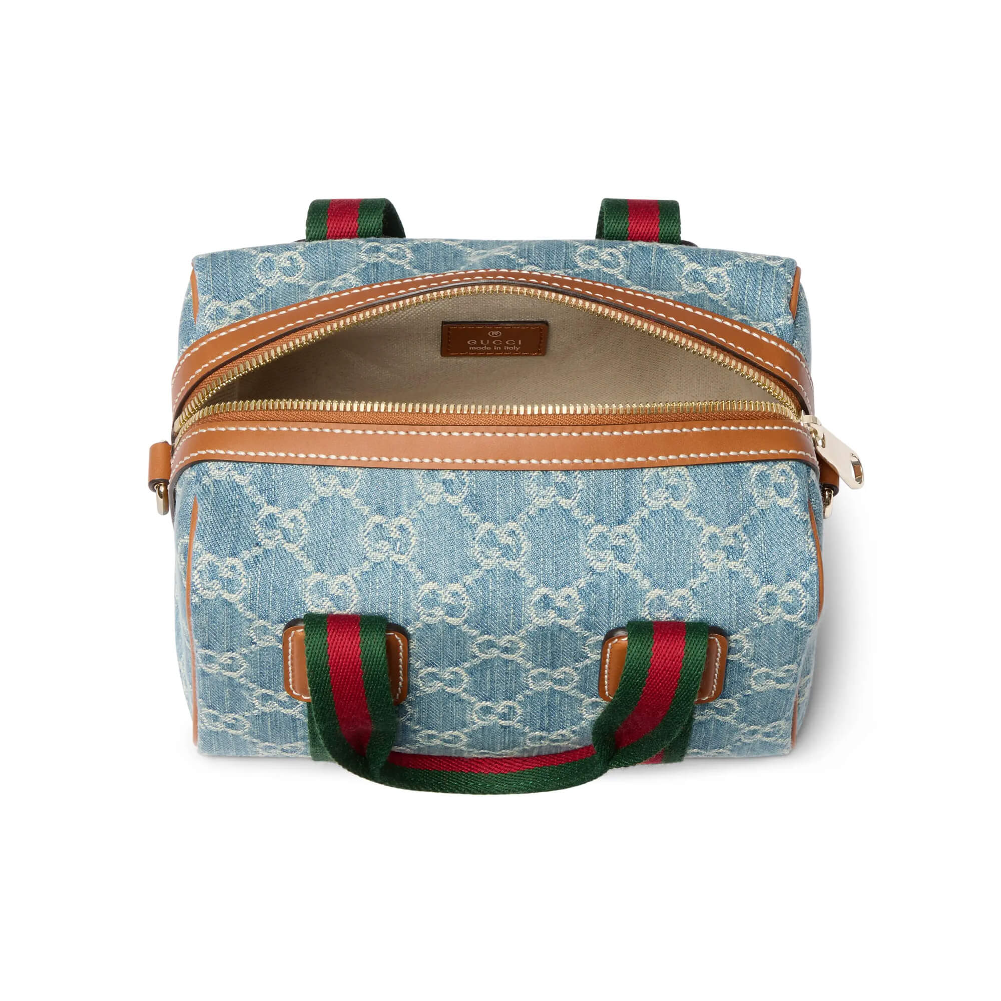 עשוי בד דנים GG בצבע תכלת ולבן, בשילוב עור בצבע חום
