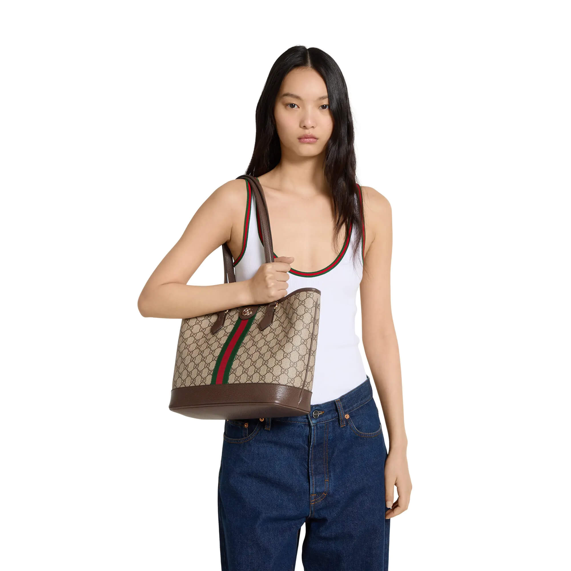תיק מבד GG Monogram מצופה בצבע בז׳ וחום
