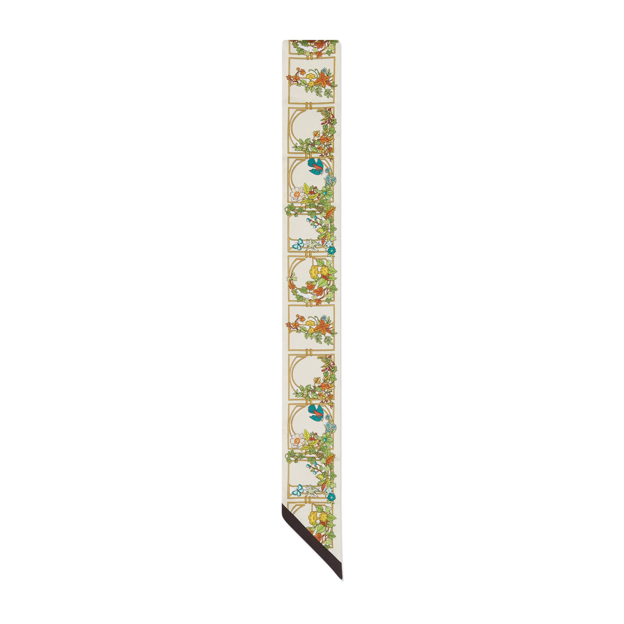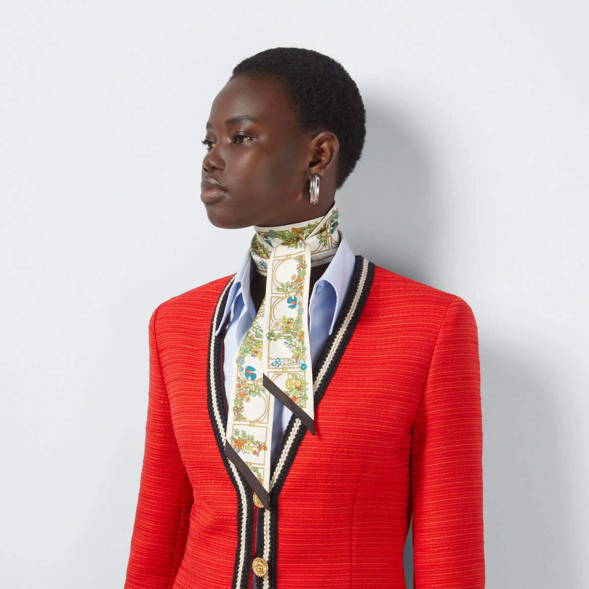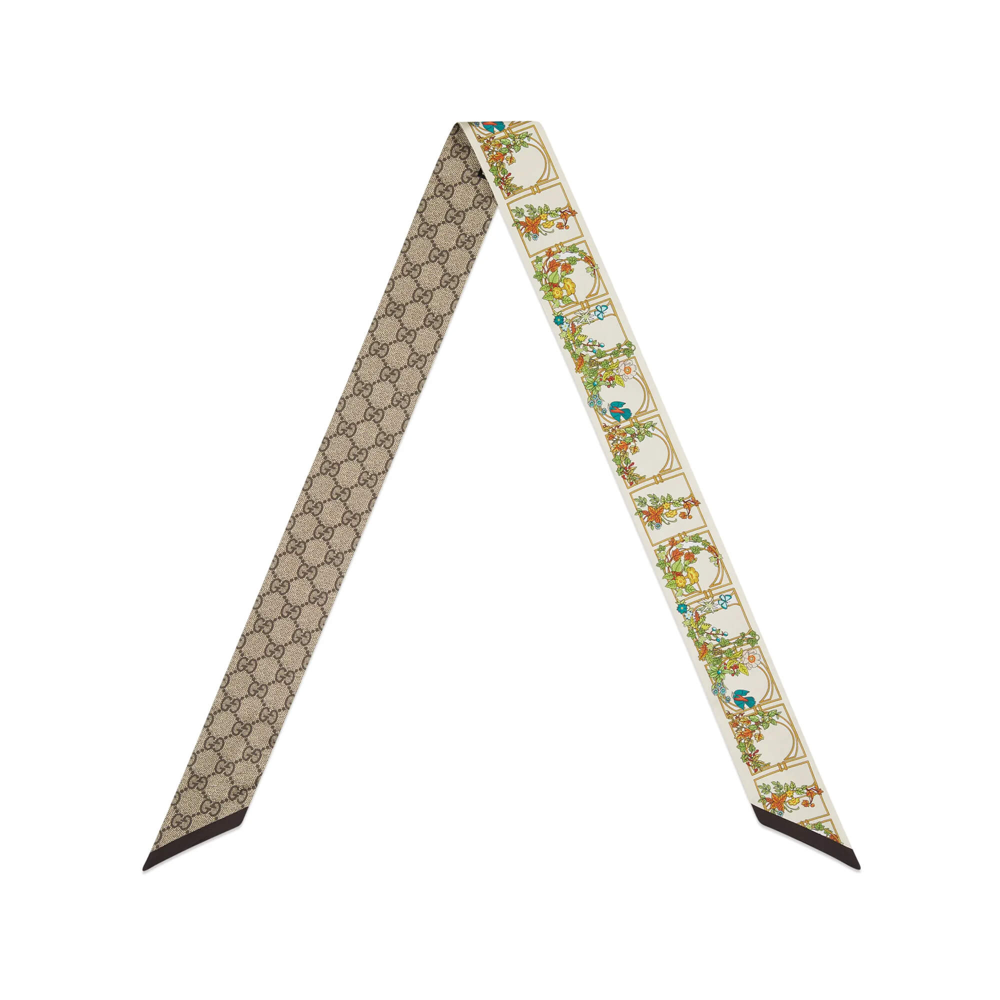 עשוי מאריג טוויל משי בצבע שנהב עם הדפס Gucci צבעוני בדוגמת חיות ופרחים בצד אחד, והדפס GG בצבע בז’ בצד השני