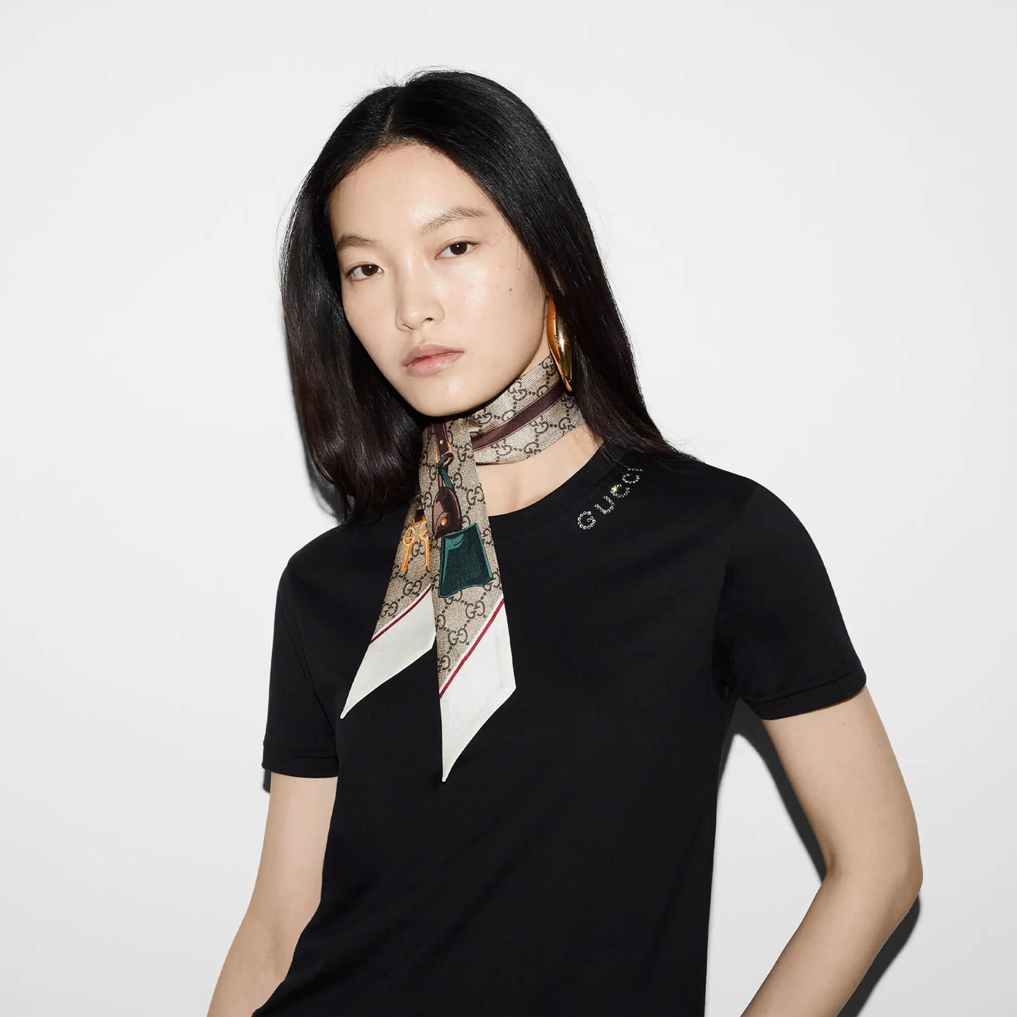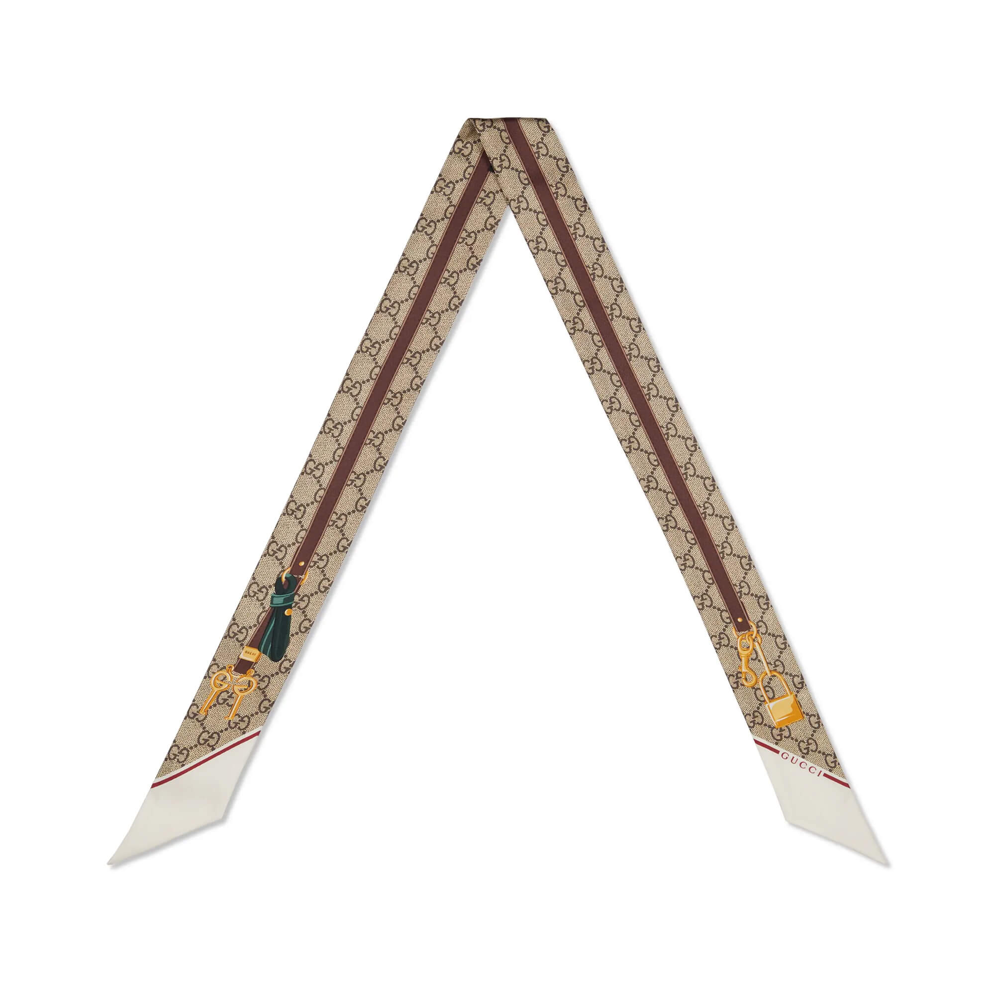 צעיף צר מבד משי בצבע בז’ עם הדפס GG והדפס GG Gucci Valigeria