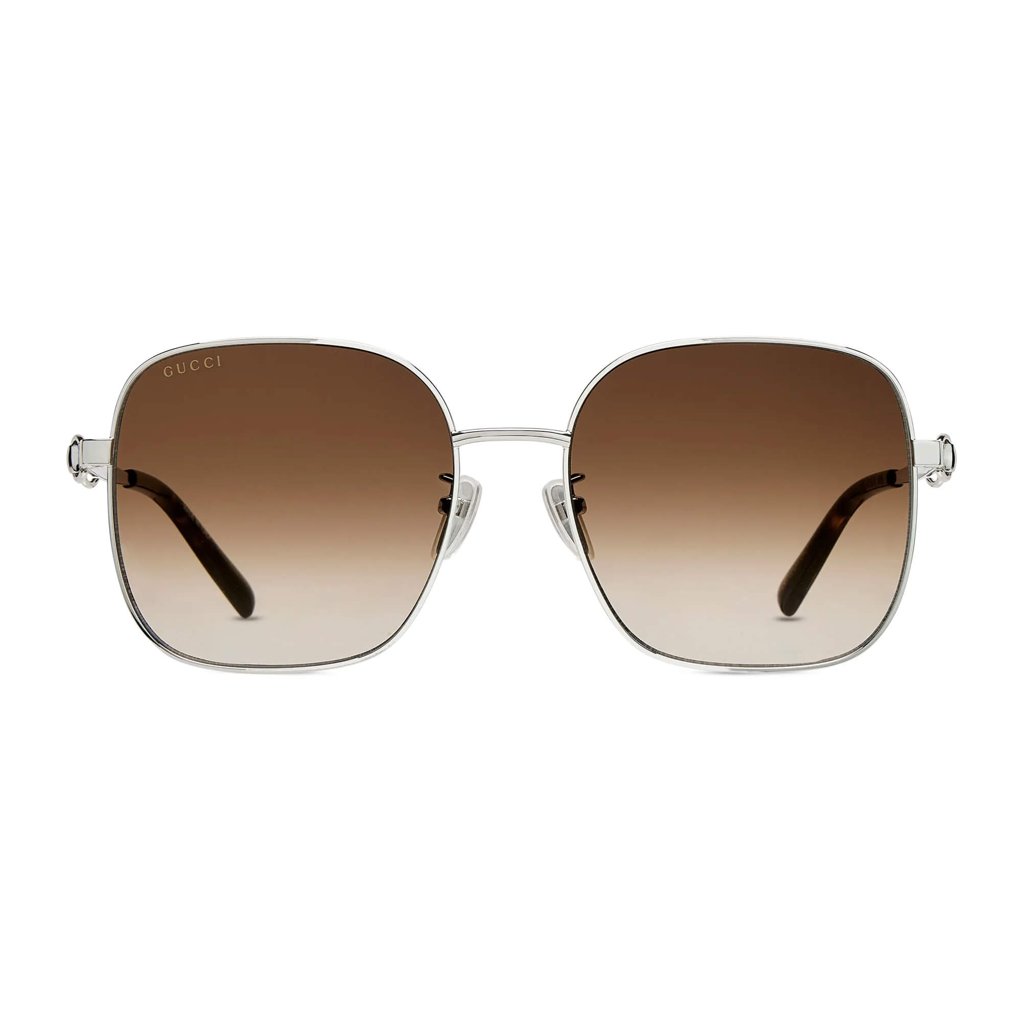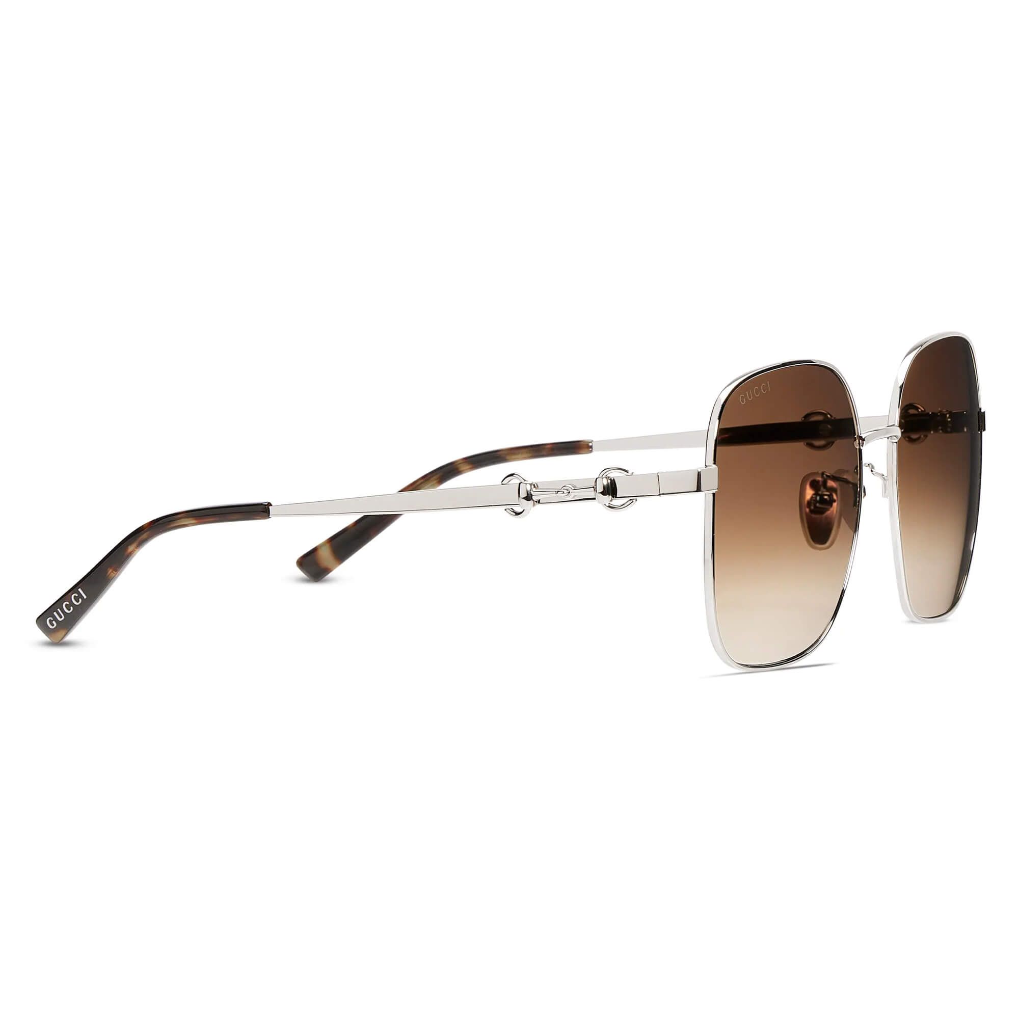 ידיות מתכת מבריקות בצבע כסף עם עיטור Horsebit וקצות אצטט בדוגמת tortoiseshell בצבע חום כהה עם לוגו Gucci