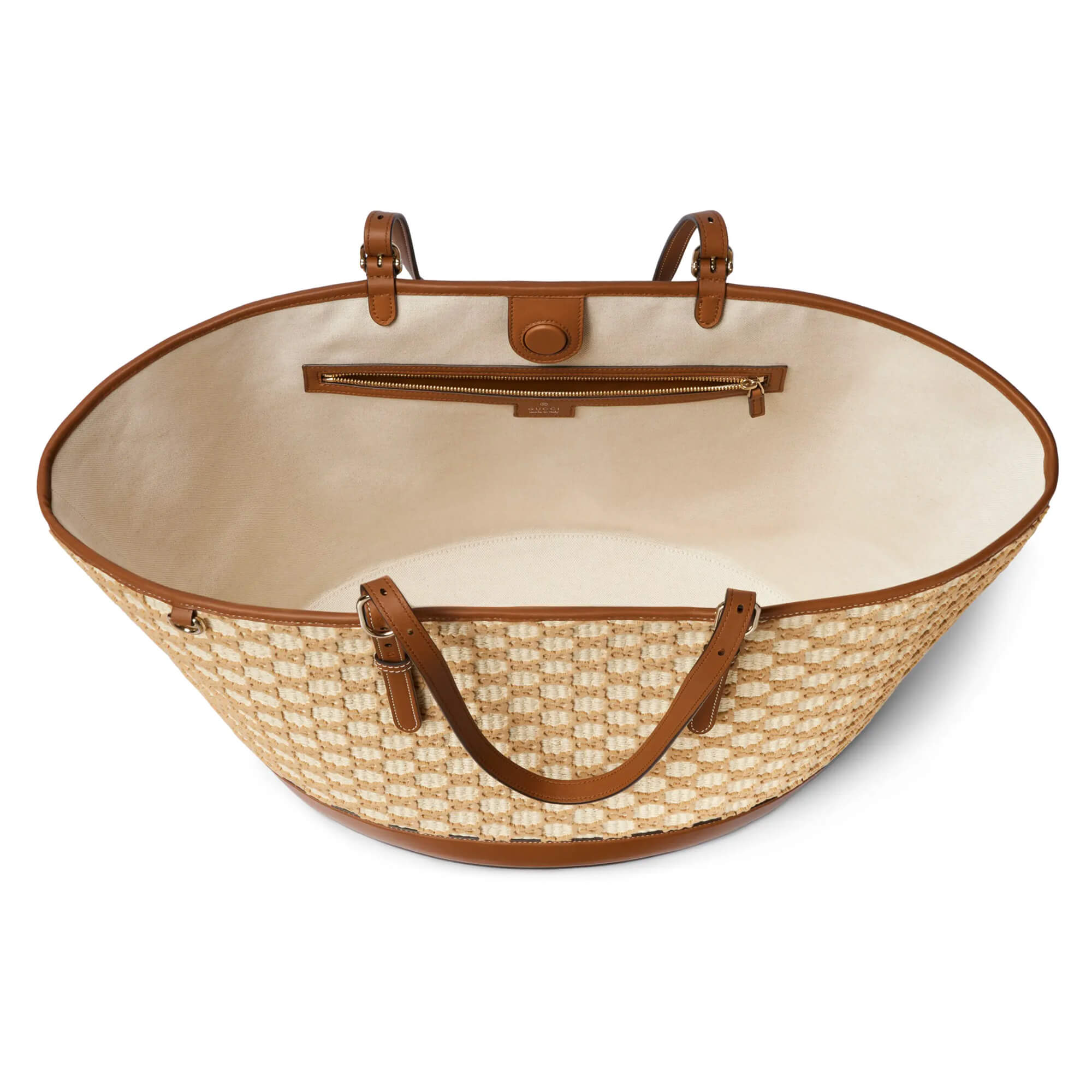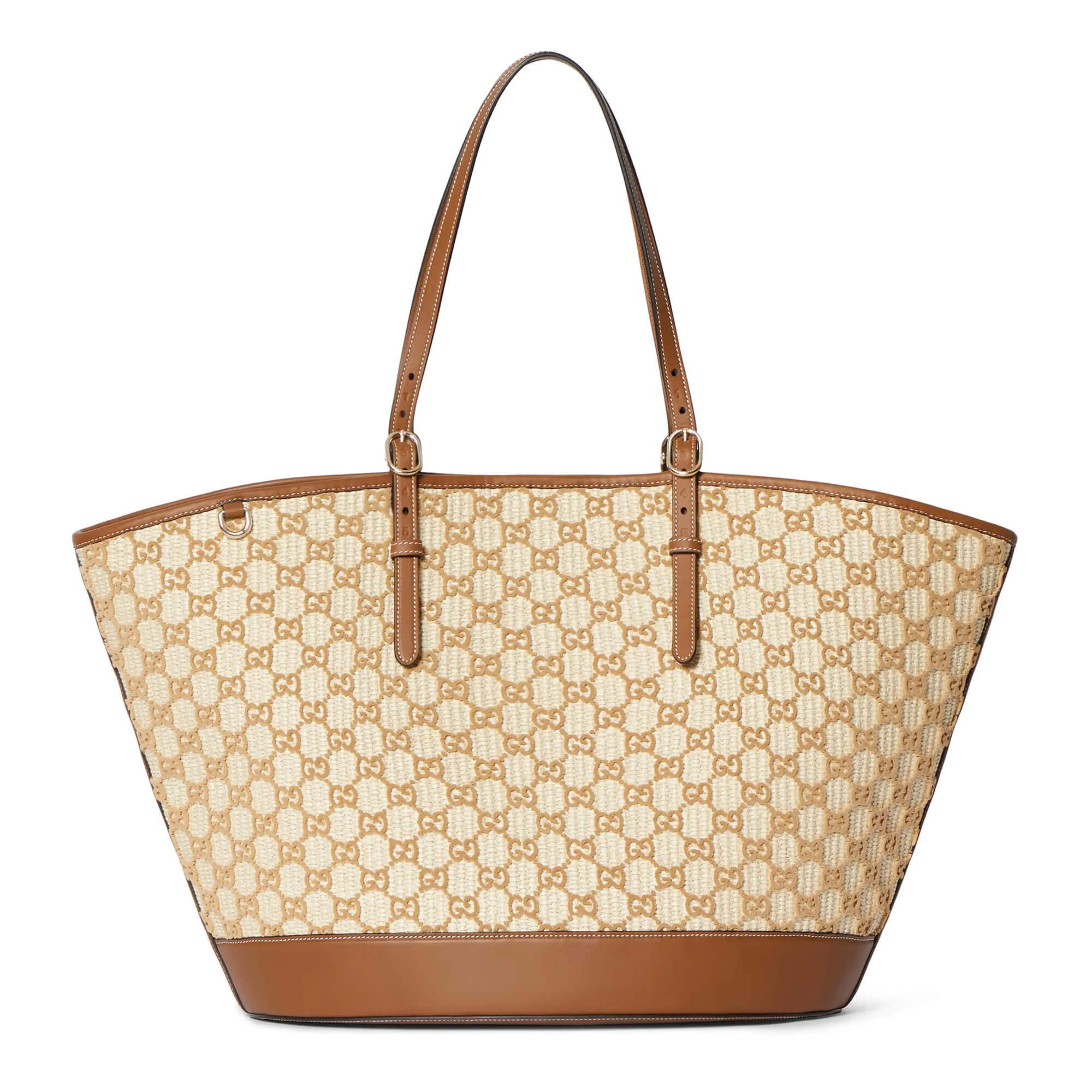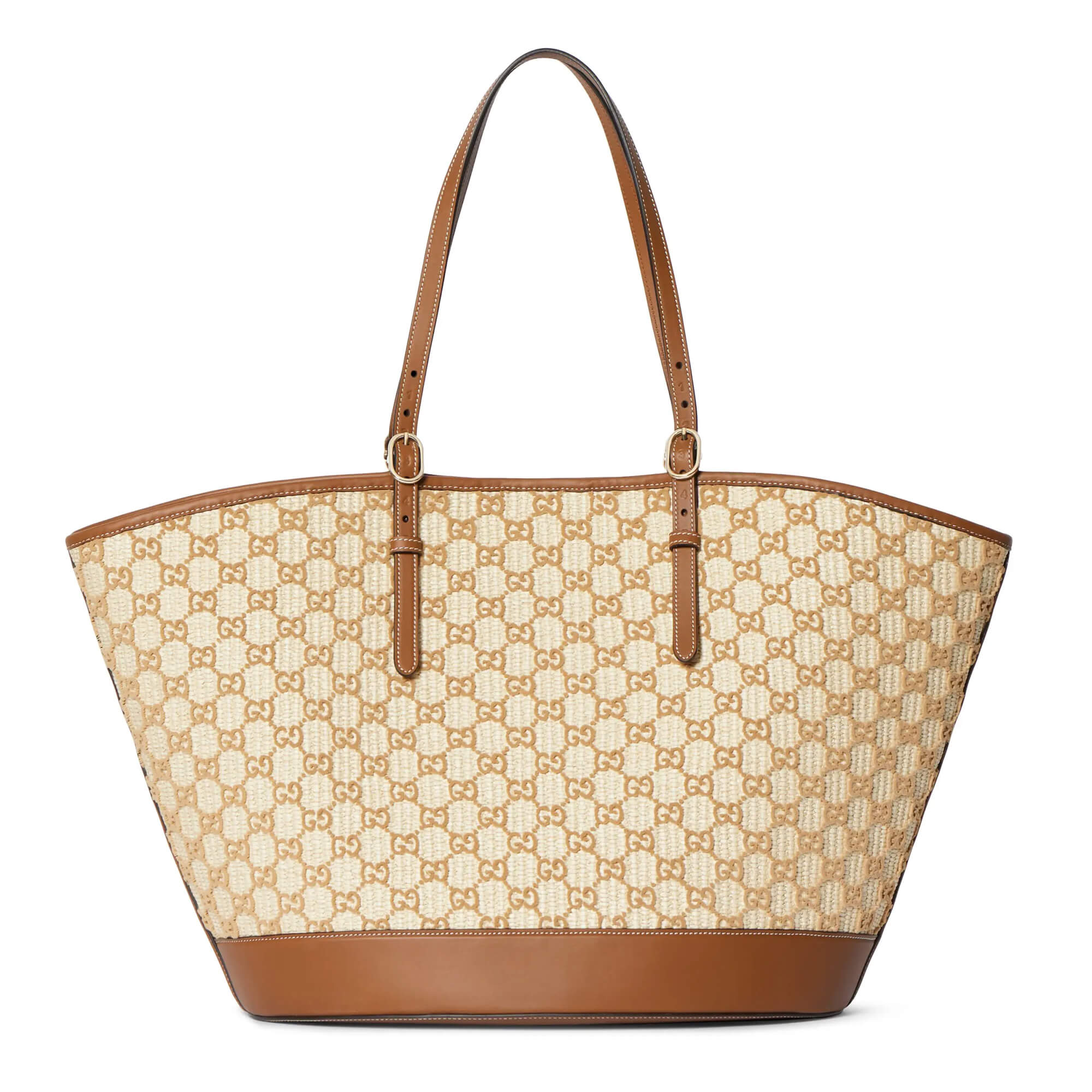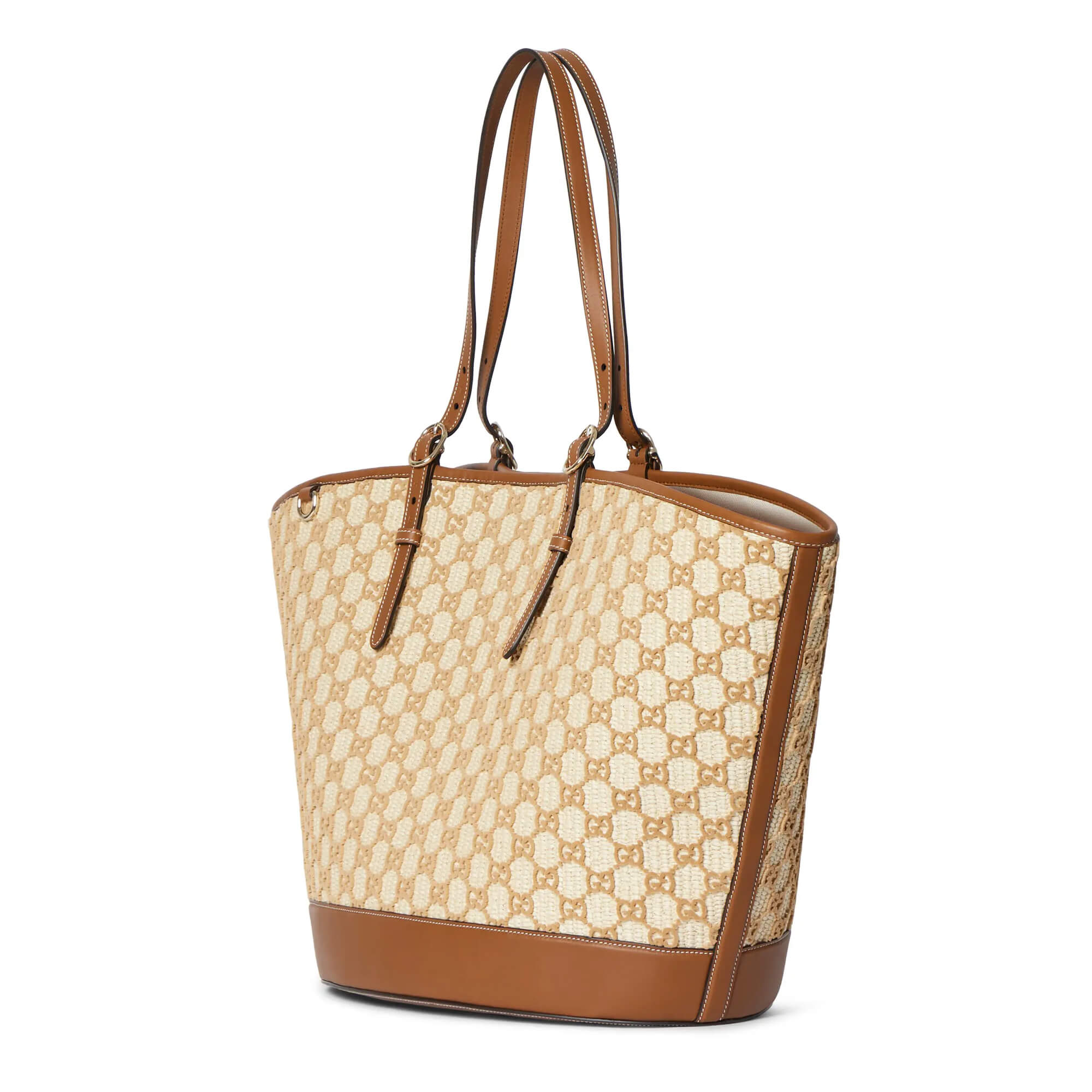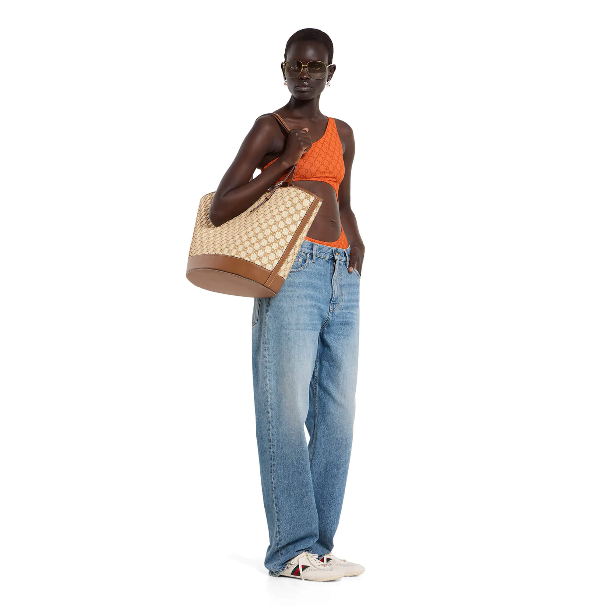תיק קש קלוע בגוון טבעי עם דוגמת GG בצבע חום